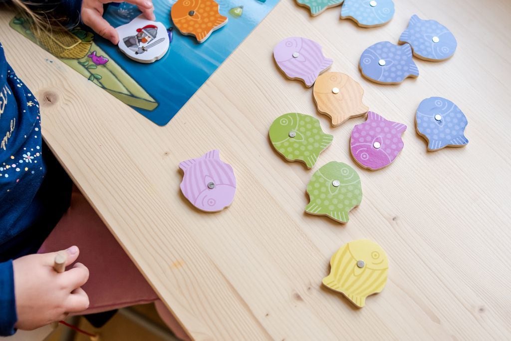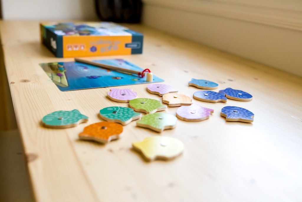 | Contenu du produit | 48 poissons en bois, 1 canne à pêche, 1 planche « Cours d'eau », 6 planches de jeu : « Panier de pêche » au recto et « Glacières » au verso |