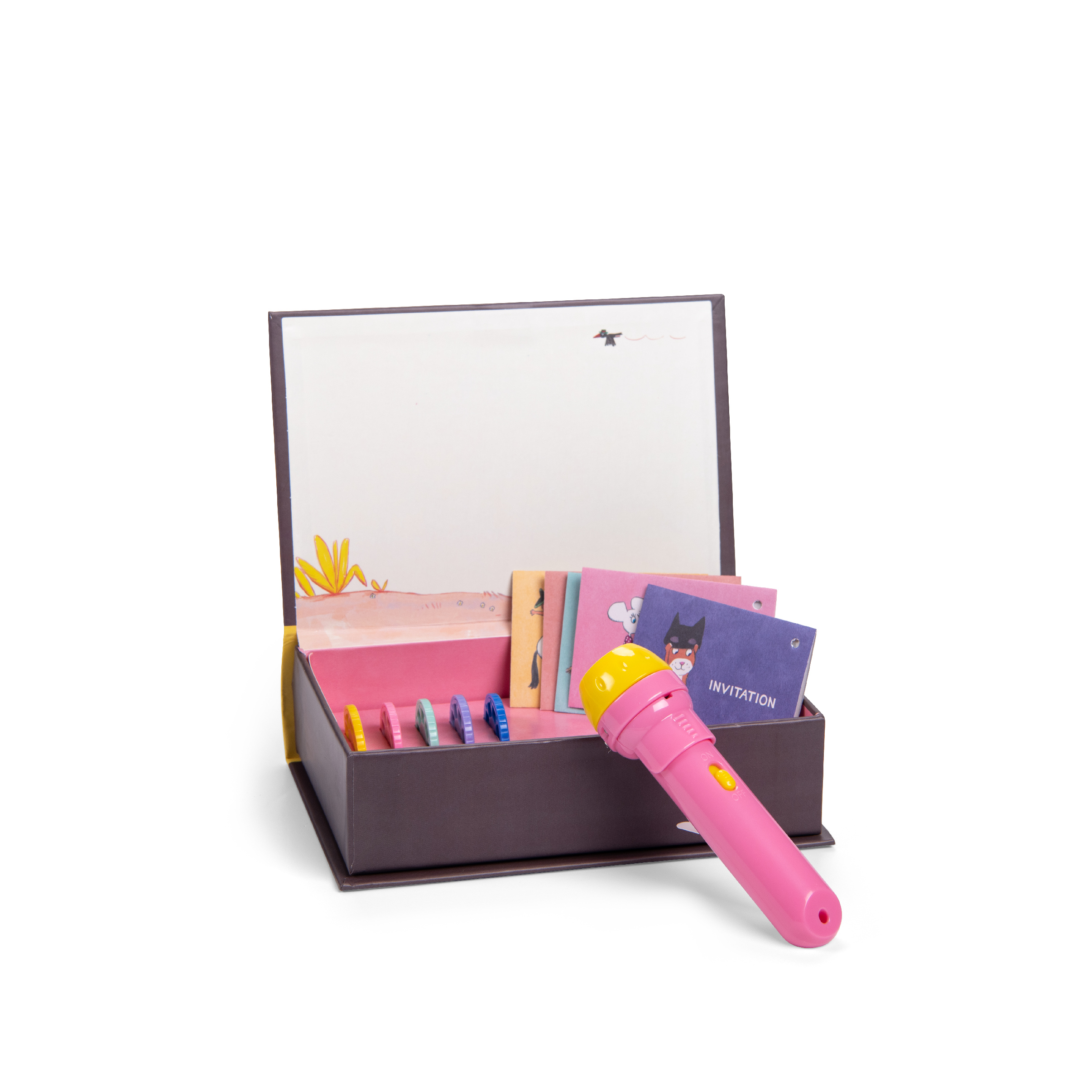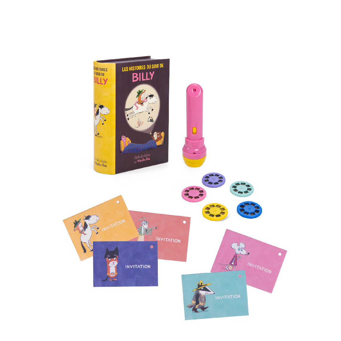 Coffret illustré, conçu comme un livre magique avec une lampe à projeter, 5 disques et 5 invitations. Chaque disque, projeté dans le livre ou sur un mur, raconte une histoire de Billy le hamster et son ami Jean-Claude de l'école des loisirs.
