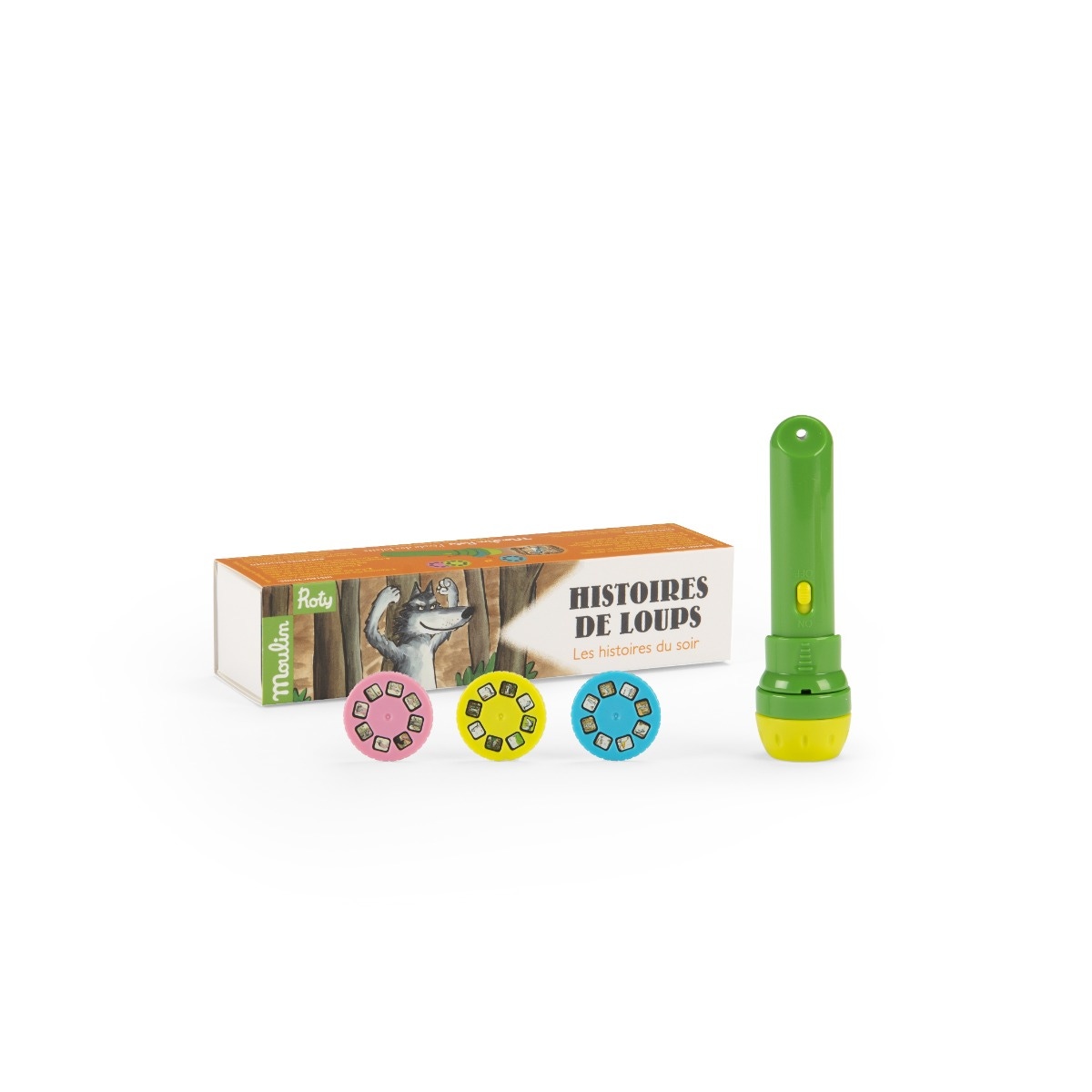 Lampe torche de poche où chacun des 3 disques projetés sur le mur raconte les aventures du Loup, héros de l'école des loisirs, pour imaginer de belles histoires. Collaboration avec la maison d'édition Ecole des loisirs. Auteur et illustrateur : Mario Ramo