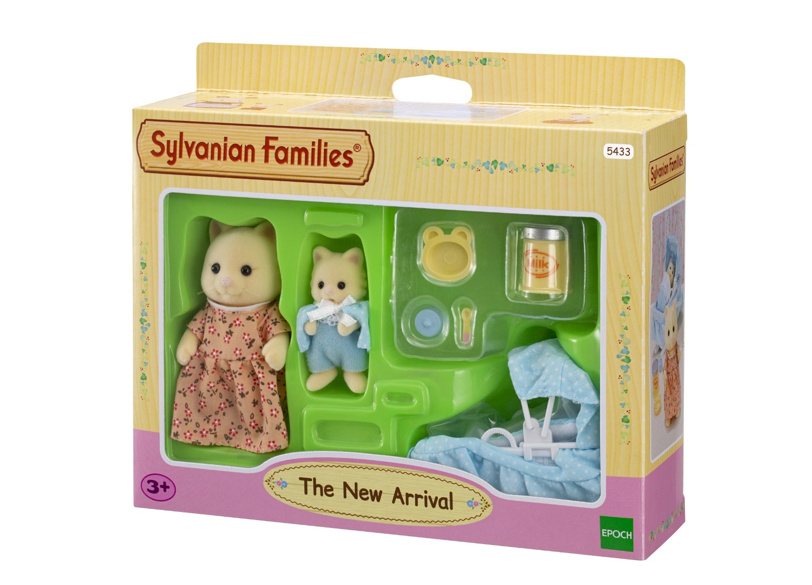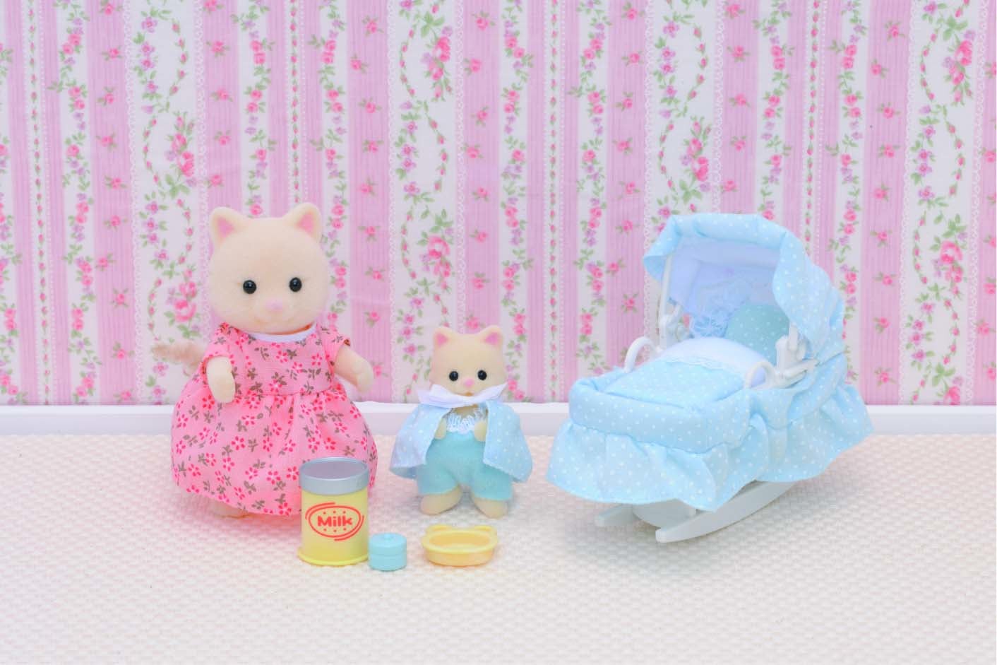 Ce set comprend 1 couffin à bascule, 2 figurines : maman et bébé chat crème et 4 accessoires.