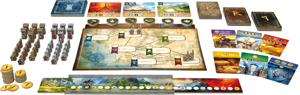 Une partie se joue en 3 chapitres successifs qui se déroulent de façon similaire. Les cartes du chapitre en cours sont mélangées puis placées selon un schéma précis avec certaines cartes visibles, d’autres faces cachées, et des cartes se chevauchant. À votre tour, prenez l’une des cartes accessibles et appliquez son effet : développez vos Compétences, gonflez votre trésor, placez des forteresses sur le plateau central, faites bouger vos troupes, rattrapez Frodon avec votre Nazgul avant qu’il n’atteigne la Montagne du Destin, faites des alliances avec les Peuples Libres, etc.