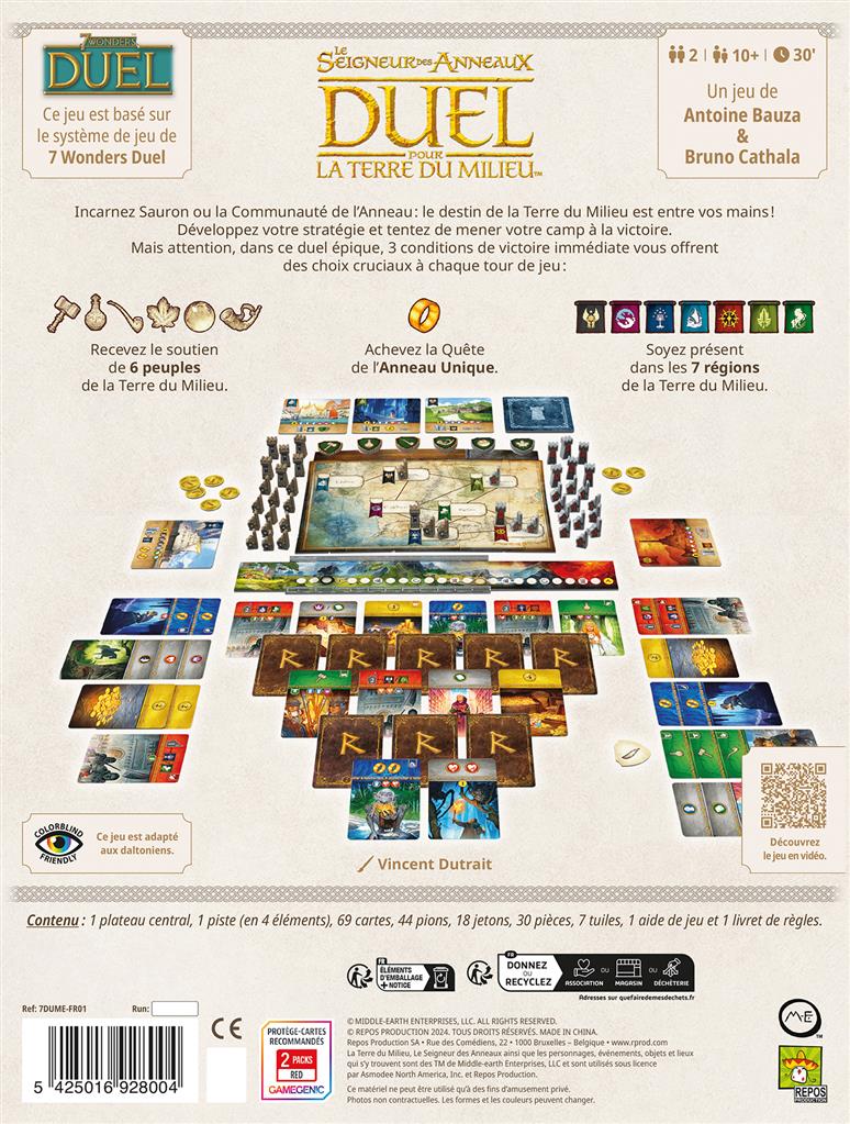 Découvrez Le seigneur des Anneaux : Duel pour la terre du milieu de Asmodée. Dirigerez-vous la Communauté de l’Anneau, pour défendre les peuples libres et détruire l’Anneau ou incarnerez-vous Sauron, pour partir à la poursuite de Frodon et Sam, tout en déversant vos hordes aux portes des cités adverses ? Le destin de la Terre du Milieu est entre vos mains ! Un jeu pour les 10 ans et +