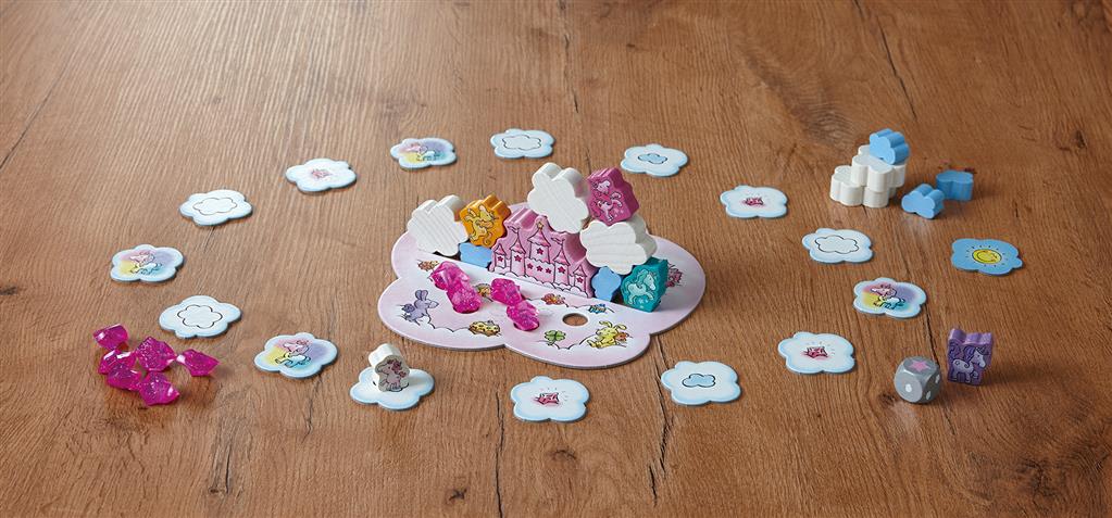 L'objectif est d’agrandir ensemble le château des nuages et de collecter des cristaux de nuage pour pouvoir accueillir toutes les licornes dans leur nouvelle demeure ! Lancez le dé et déplacez Rosalie, le bébé licorne, sur les tuiles Nuage qui entourent le château. Selon le type de nuage où elle atterrit, prenez un gros nuage blanc, un petit nuage bleu ou une licorne et empilez-là sur ou contre le château. Si vous parvenez à empiler tous les éléments, tout le monde gagne la partie ! Attention, si tu fais tomber des éléments, retourne des tuiles ‘nuage’, si un orage apparait pour une troisième fois, tout le monde perd.