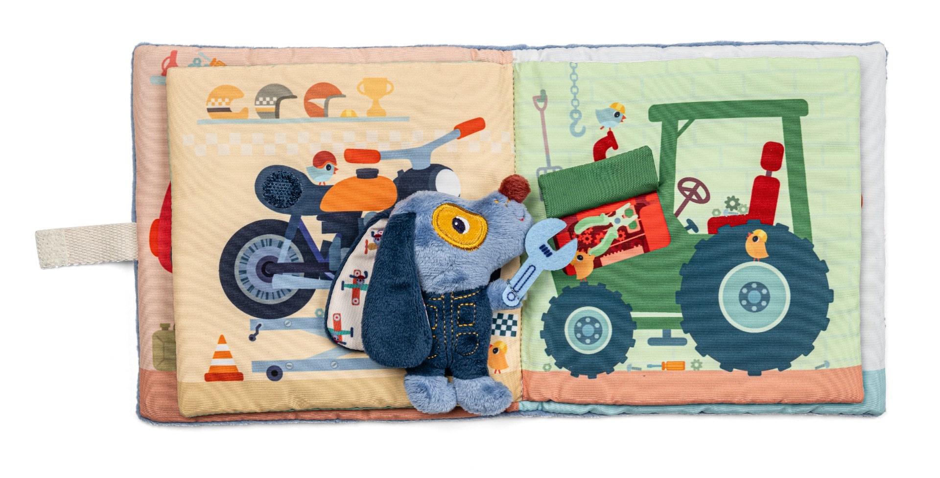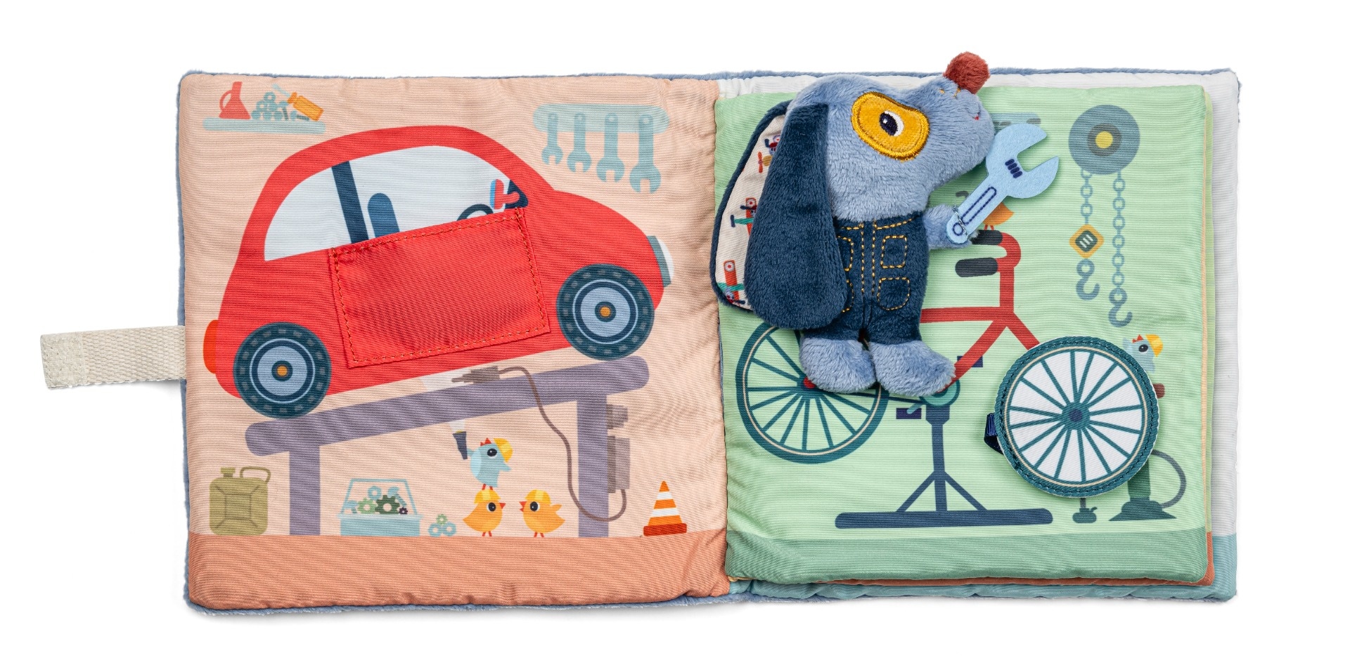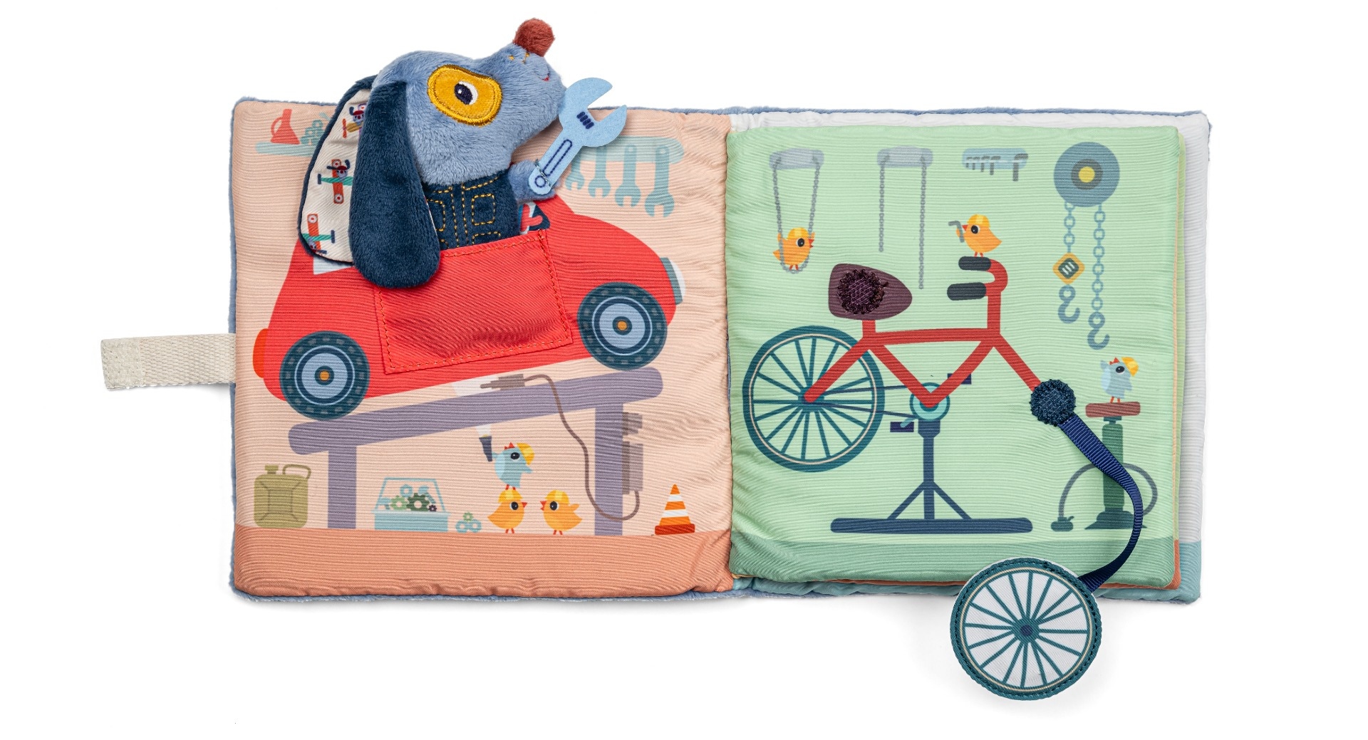 Découvrez ce qu'il se passe dans le livre d'activités le garage de Jules de Lilliputiens. Chaque page cache une activité et montre un moyen de transport. Une petite peluche Jules accompagne le lecteur au fil des pages et prend place à différents endroits dans le livre, rendant l'expérience encore plus interactive.