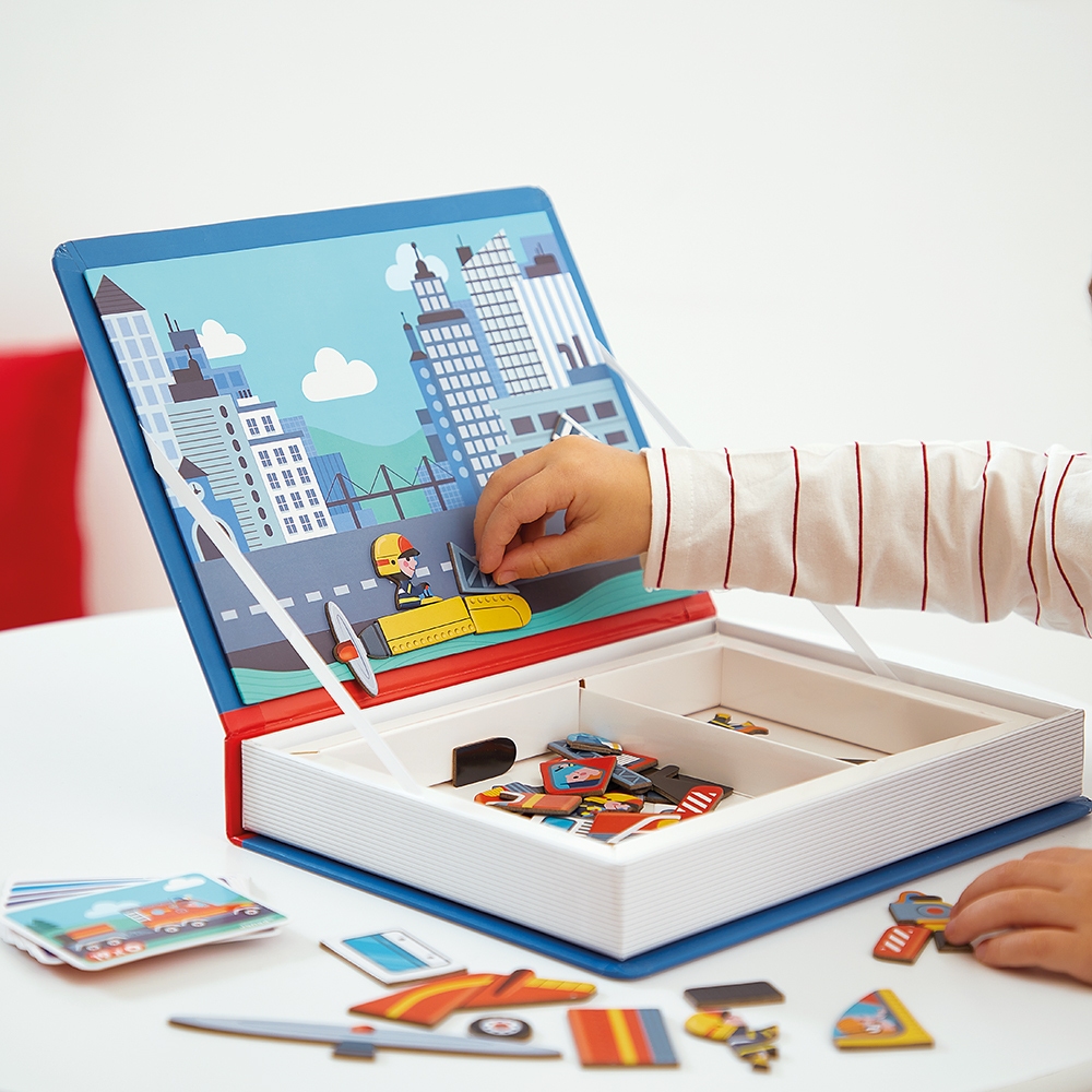 Intégrer l'équipe des pompiers et partez en intervention avec eux ! Ce jouet magnétique se compose de 60 magnets et 18 cartes. Le but du jeu est de reproduire les véhicules sur la scène magnétique en suivant les modèles des cartes. Ainsi, votre enfant pourra reproduire le célèbre camion de pompiers avec la grande échelle mais aussi un hélicoptère, un avion ou un bateau ! Au-delà de son aspect éducatif, le Magnéti’book pompiers permet de mixer les magnets entre eux pour laisser libre court à la créativité de votre enfant et ainsi créer de nouveaux véhicules. Jouet magnétique en carton FSCTM. Jouet éducatif pour les enfants à partir de 3 ans.