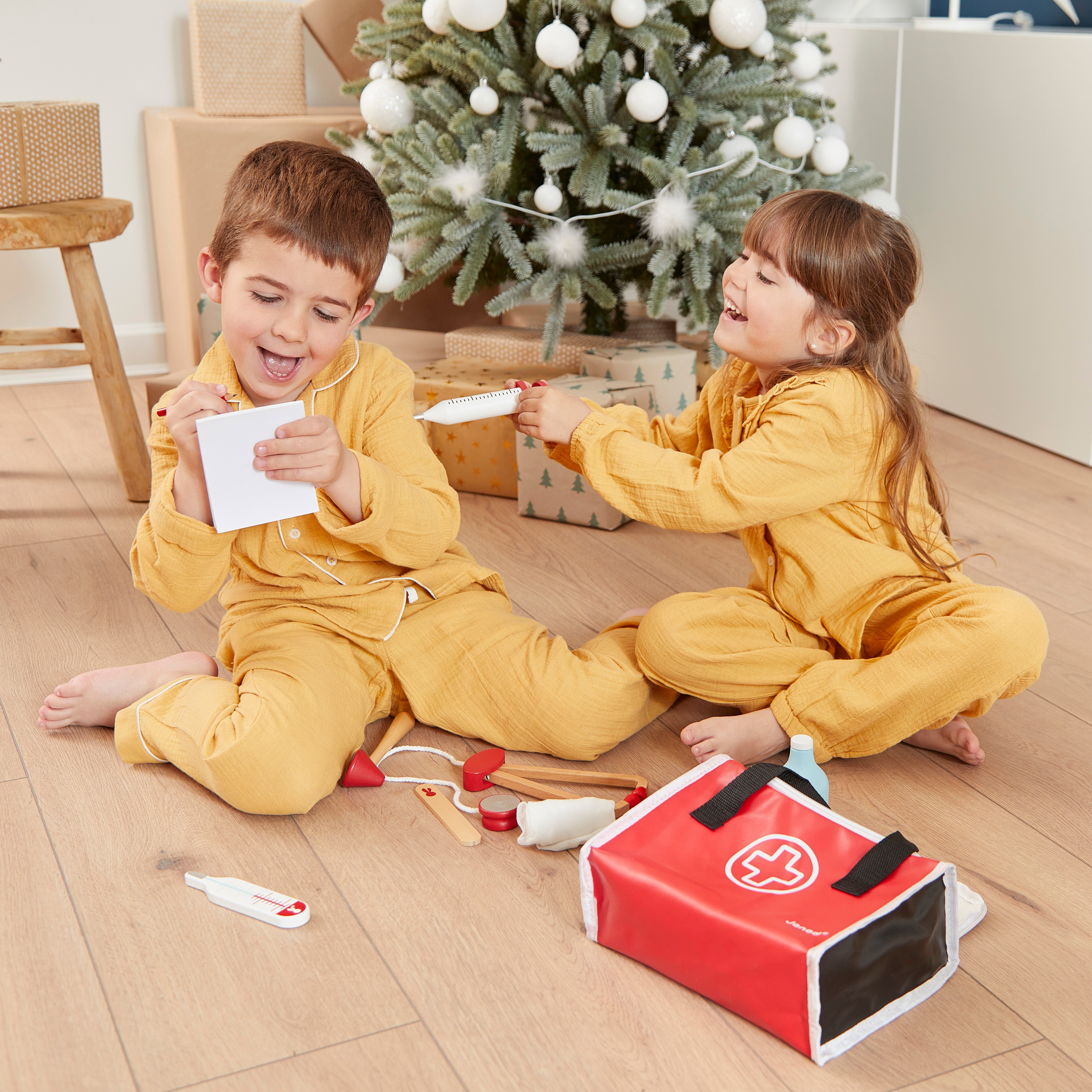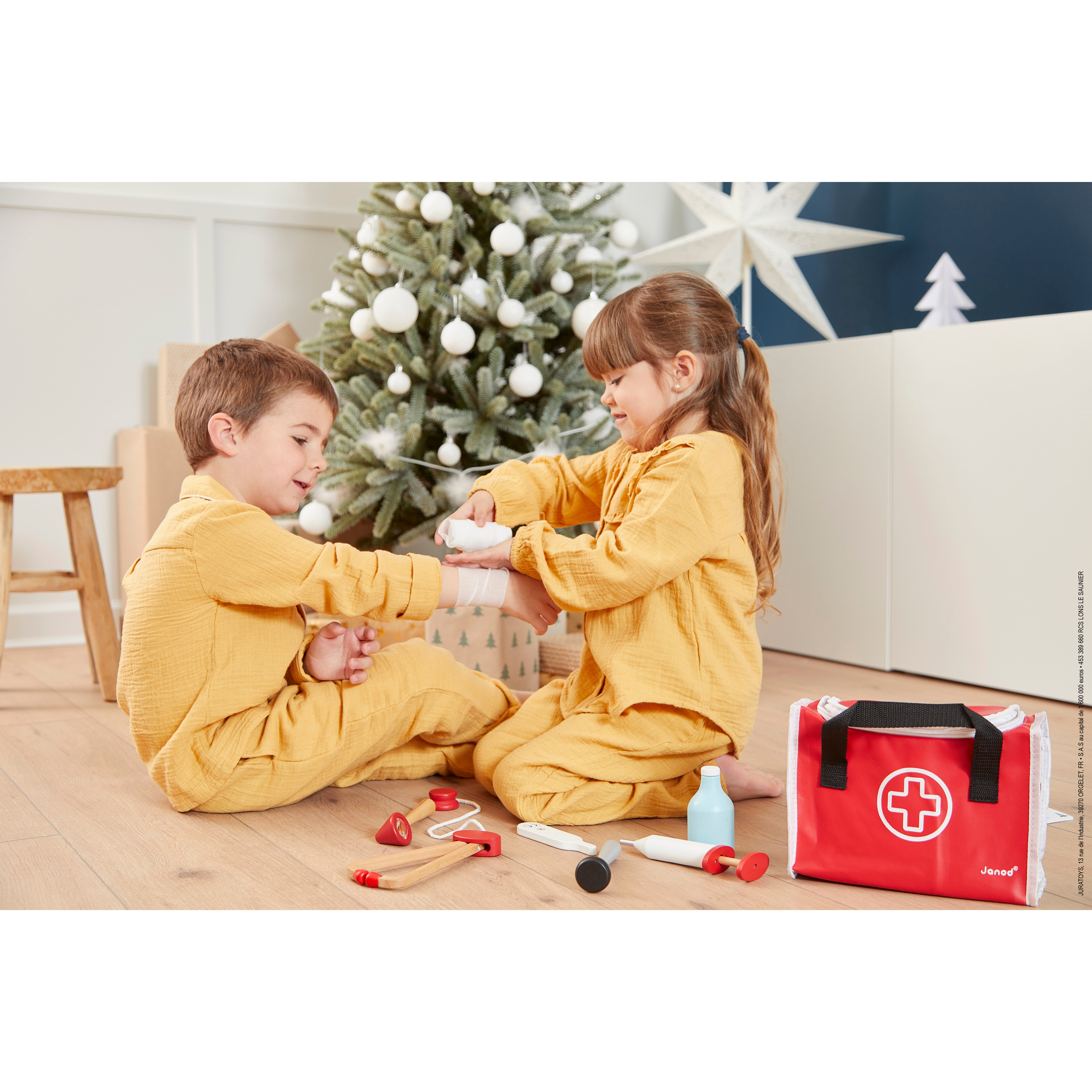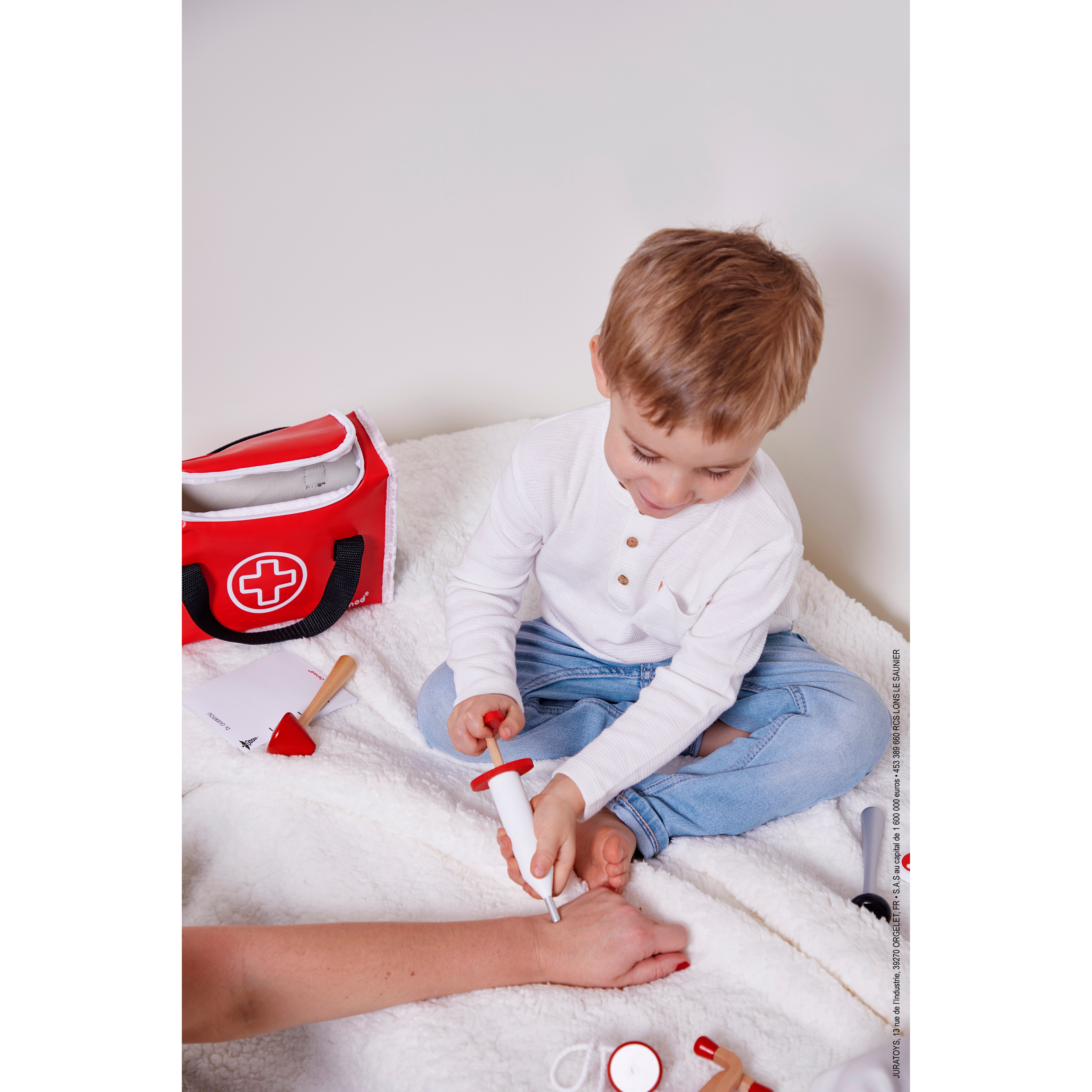 Toute la panoplie nécessaire pour soigner et panser tous les petits bobos de ses doudous adorés. 10 accessoires: une seringue équipée d'un ressort intérieur, un marteau pour les réflexes, une bouteille de désinfectant, un stéthoscope, un otoscope équipé d'une loupe, un thermomètre, une languette, un calepin d'ordonnance (30 pages) avec un crayon de papier et un rouleau de bandage. Accessoires en bois massif et mallette en PVC matt. Livrés dans une magnifique mallette rouge et noire équipée d'un zipper en métal et de deux poignées en tissu. Impression des accessoires par sérigraphie. Cale en carton à l'intérieur de la mallette. Cavalier fixé tout autour de la mallette avec polybag de protection pour le transport.