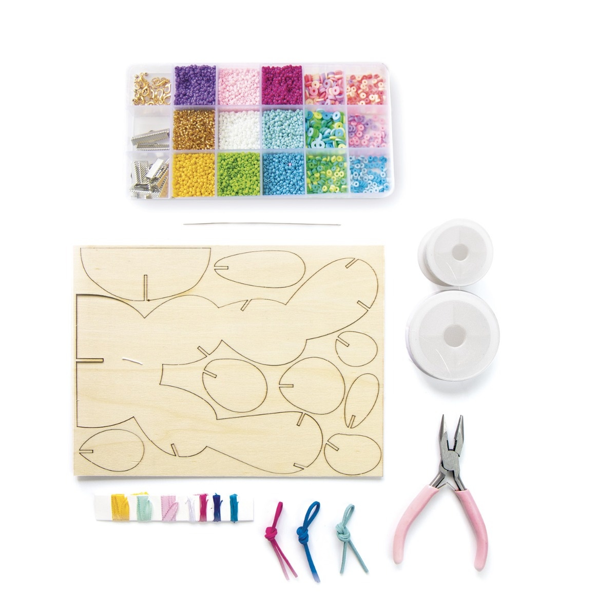 Contenu de cette boîte : perles rocaille, perles heishi, charms, accessoires de bijoux, boîte à compartiments pour ranger les perles, rubans, fils de nylon, cordon suédine, fil élastique, pince à bijoux, porte bijoux en bois, métier à tisser bois et métal, aiguille pour tisser et 1 livret pas à pas.
