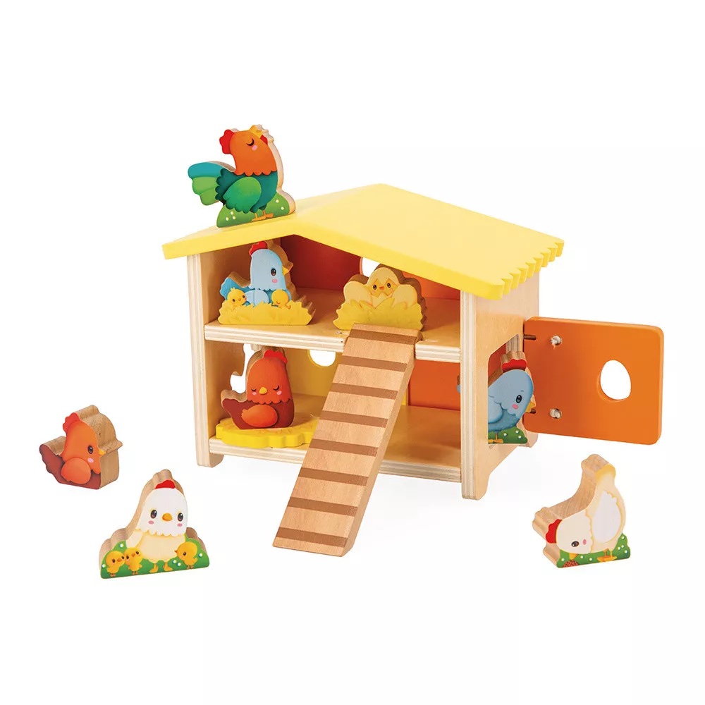 Cocorico ! Le coq chante, le jour se lève, il est l'heure de se réveiller. La basse-cour s'éveille lentement, maman poule prend soin de ses petits, as-tu vu le nid ? Combien d'œufs se cachent à l'intérieur ? Ce joli poulailler composé de 9 poules en bois et d'une échelle amovible, est parfait pour accompagner l'enfant dans le développement de son imagination. En plus des personnages, le poulailler renferme de nombreuses possibilités de développement de jeux, comme la poule à forme sur le côté de la maison, quelle est la bonne poule à venir placer à l'intérieur ? Ou sa porte sur élastique de l'autre côté, et sa porte coulissante sur le devant. Un jouet d'imitation en bois FSCTM complet et riche en histoire. Jouet pour les enfants à partir de 18 mois.