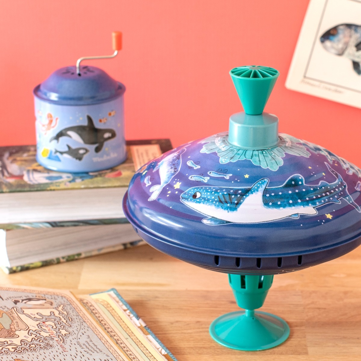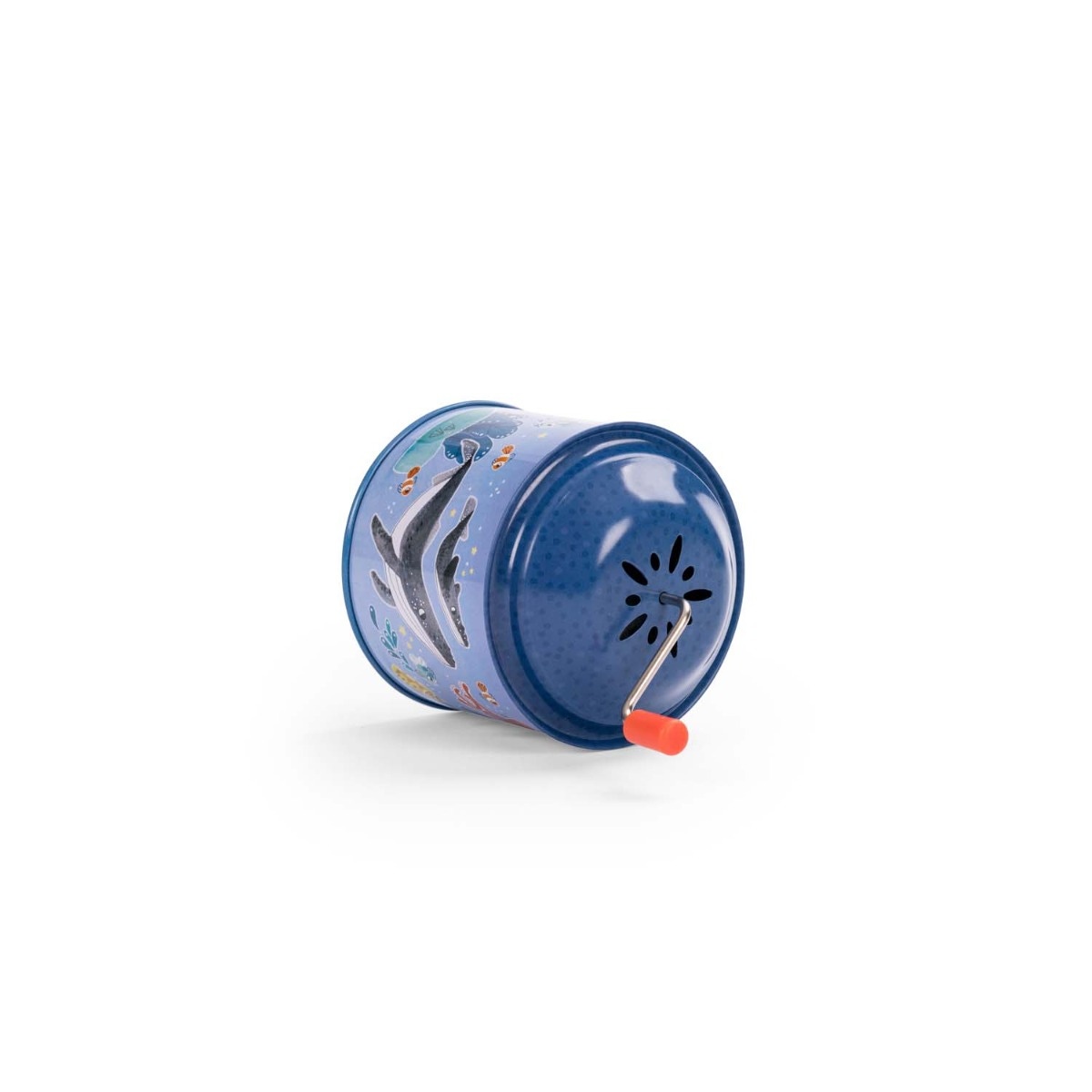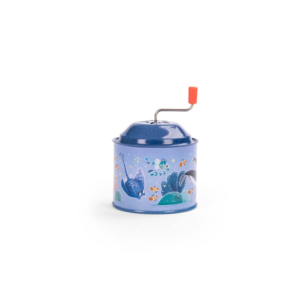 Tourne, tourne et en avant la musique ! Clin d'œil aux jouets qui ont accompagné notre enfance, le moulin à musique en métal coloré met en scène les amis de Paulie explorant les fonds marins.