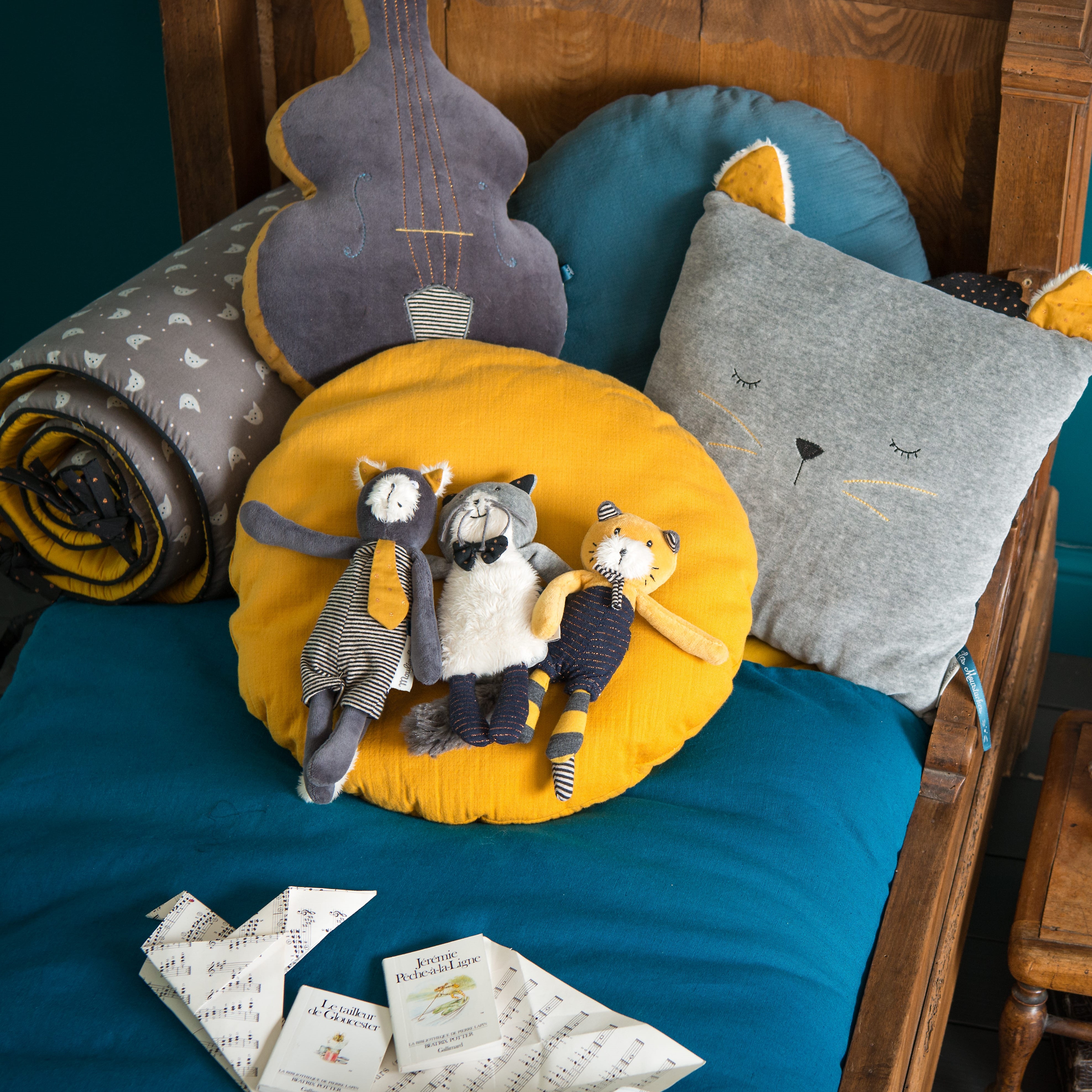 Coussin chat dormeur gris clair Les Moustaches Moulin Roty