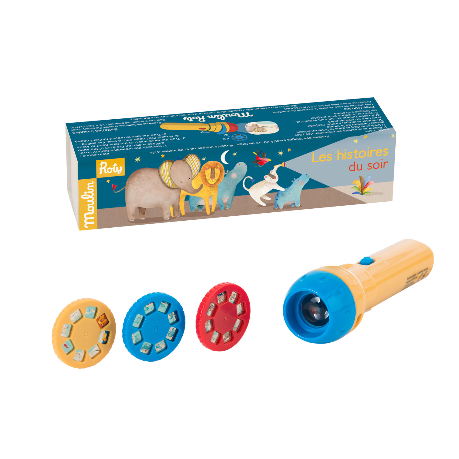Petite lampe torche dans laquelle s'insèrent 3 disques différents, racontant chacun une histoire ayant pour thème la savane des Papoum à projeter sur le mur : la douche des éléphants, l'appel de la maman hippopotame, la découverte des lionceaux. L'histoire du soir prendra des allures de petit spectacle avec cette lampe : ouvrez grands vos yeux et place à l'imagination ! A partir de 4 ans. Les piles sont fournies avec le produit. CLIQUEZ ICI POUR VOIR LE DETAILS DES HISTOIRES Retrouvez sur Jeujouet.com toutes les lampes à histoires de Moulin Roty.