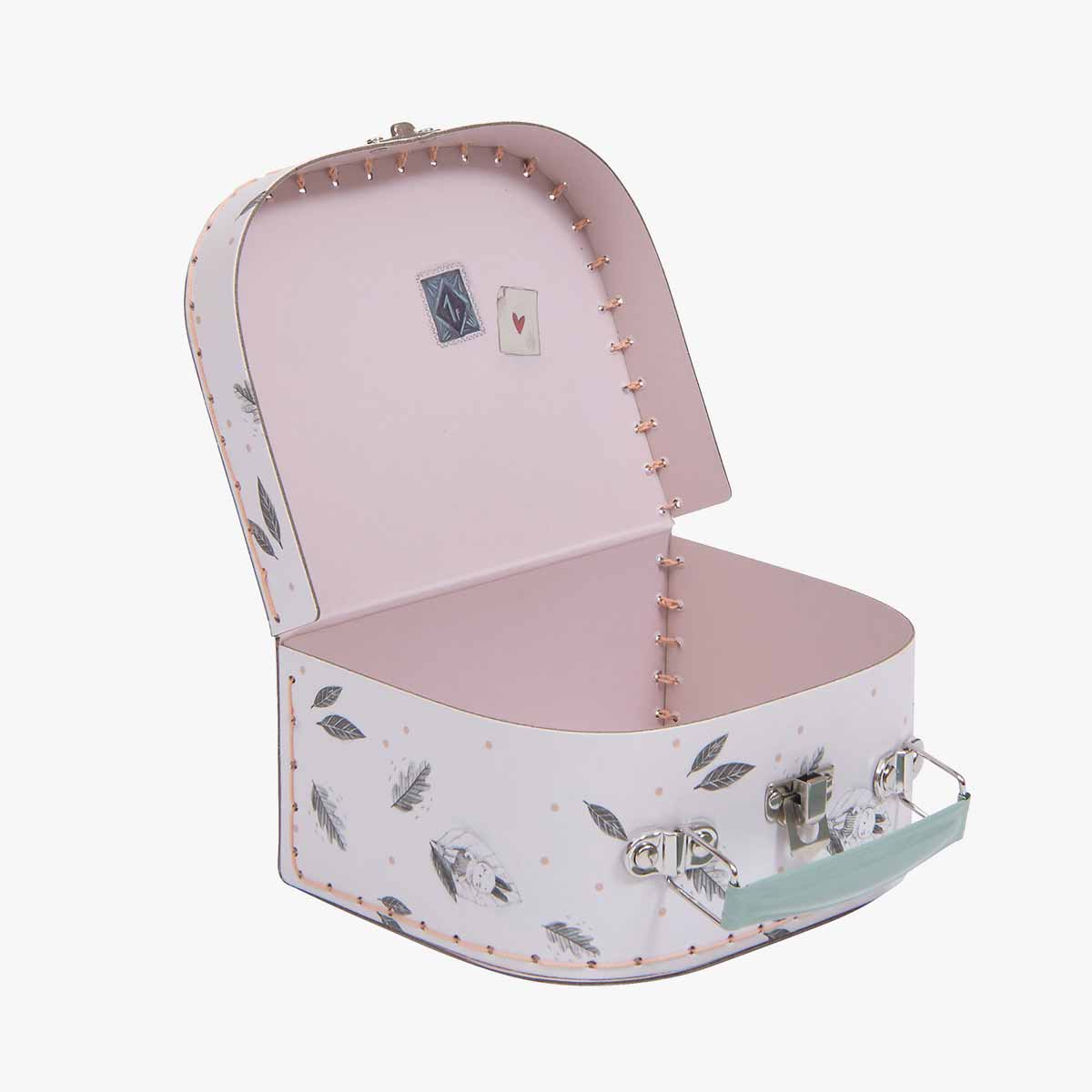Valise déco de la collection Après la pluie de Moulin Roty en carton avec finition cousue, poignée et ouverture métal. Illustrée de l'univers délicat d'Après la pluie, motif feuilles sur fond crème, elle permettra de ranger et transporter les personnages et trésors de la collection !