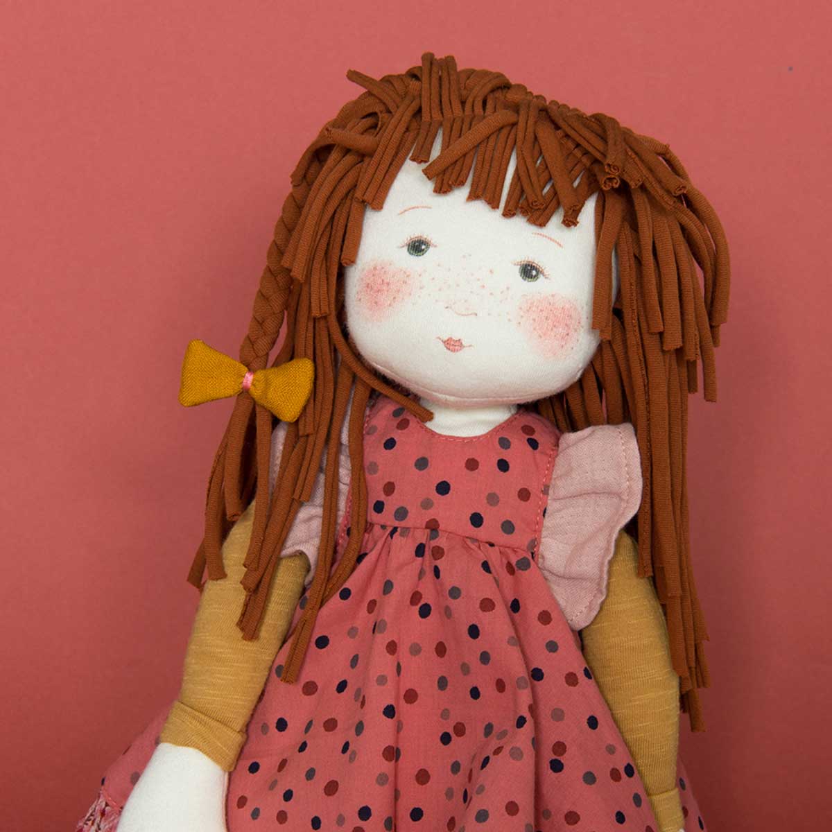 Un superbe cadeau . Une nouvelle amie de jeu, de câlins, d'aventures et aussi pour décorer la chambre. Voici Anémone, une grande poupée de 57 cm au doux visage illustré et imprimé dans un style très seventies. Elle a de beaux cheveux roux en jersey rouleauté, une jolie robe à volants et à pois et des chaussons de danse pailletés avec rubans de satin. Dès 18 mois.