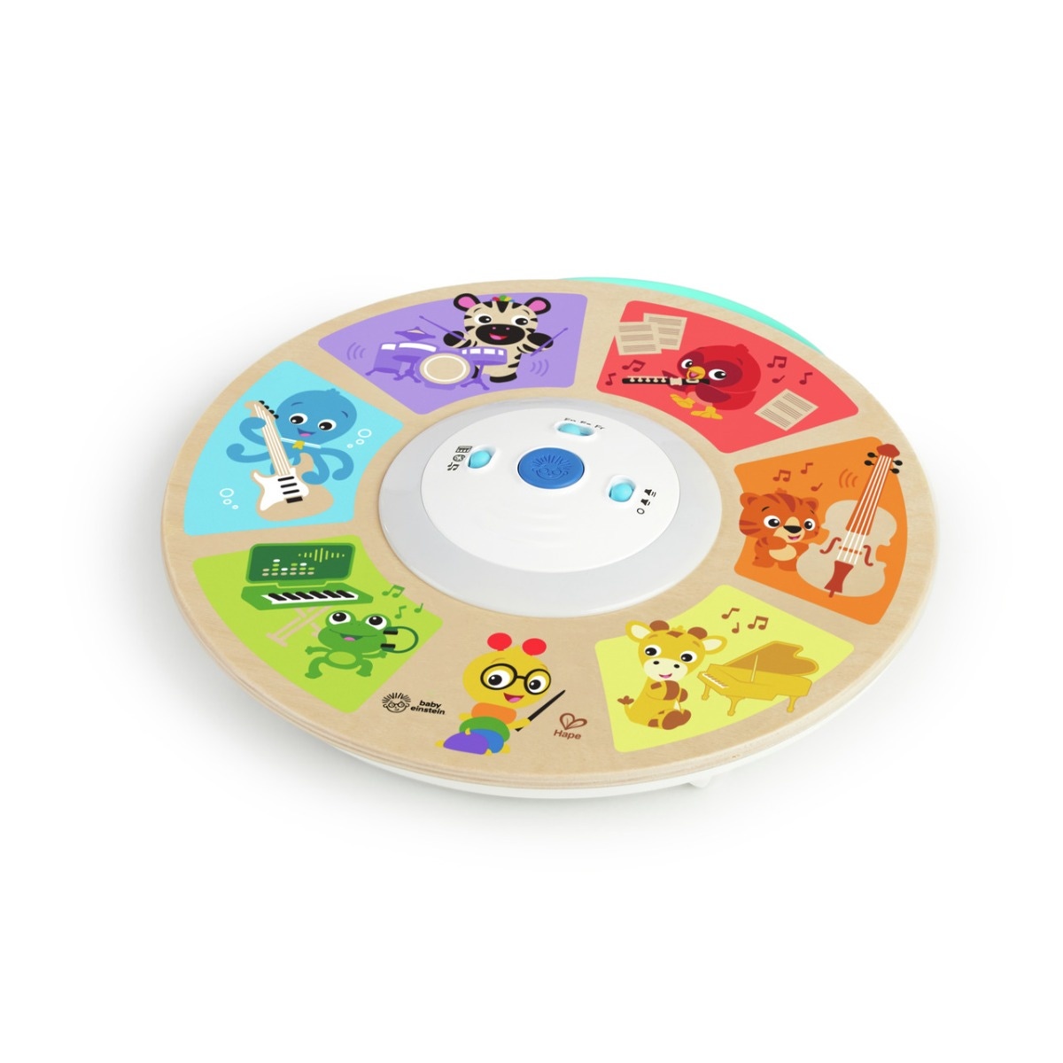 Avec les touches sonores qui s'illuminent au toucher, l'orchestre Magic Touch de la gamme Baby Heinstein de chez Hape permet de composer ses propres mélodies, écouter différents instruments, ou encore apprendre leurs noms en plusieurs langues (français, anglais et Espagnol).