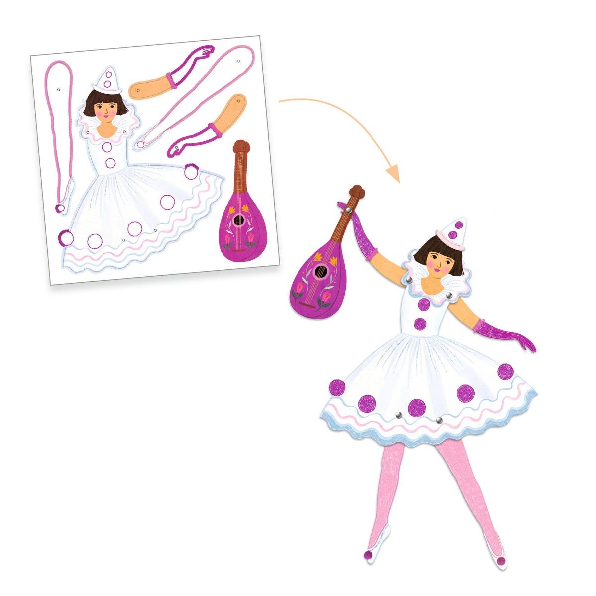 Une pochette de coloriage et d’assemblage pour réaliser 6 pantins. L’enfant colorie et détache les pièces cartonnées puis il les assemble pour créer de jolis pantins. Il ne reste plus qu’à les animer et faire danser toutes ces demoiselles en tutus!