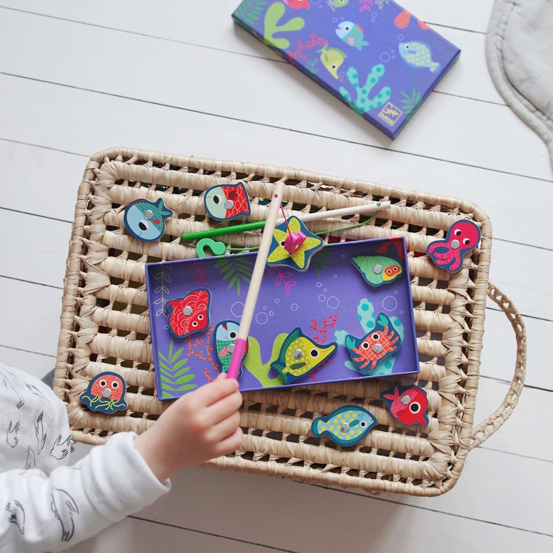 Prêts pour une partie de pêche ? Des animaux de la mer en bois, 2 cannes à pêche et une jolie boîte qui se transforme en fond marin. L'enfant attrape les pièces en bois aimantées à l'aide de la canne. La partie de pêche peut commencer ! Pour les petits pêcheurs à partir de 2 ans. Contenu : 12 pièces (bois et métal) et 2 cannes à pêche (bois, plastique, aimant), 1 boîte décorative.
