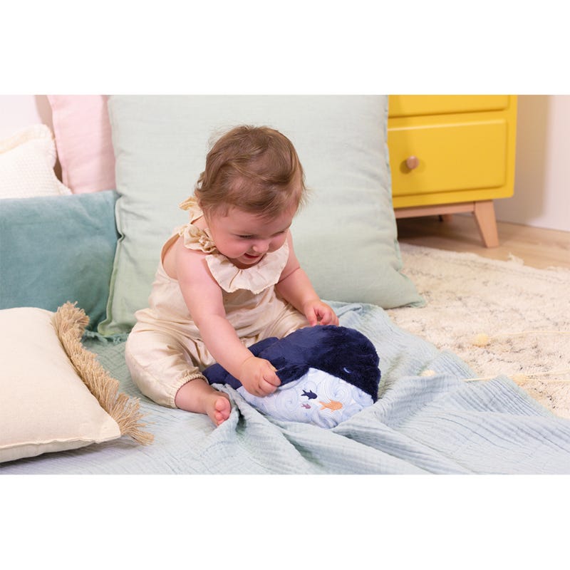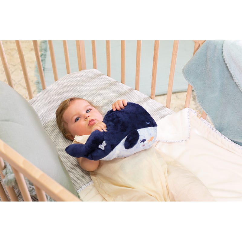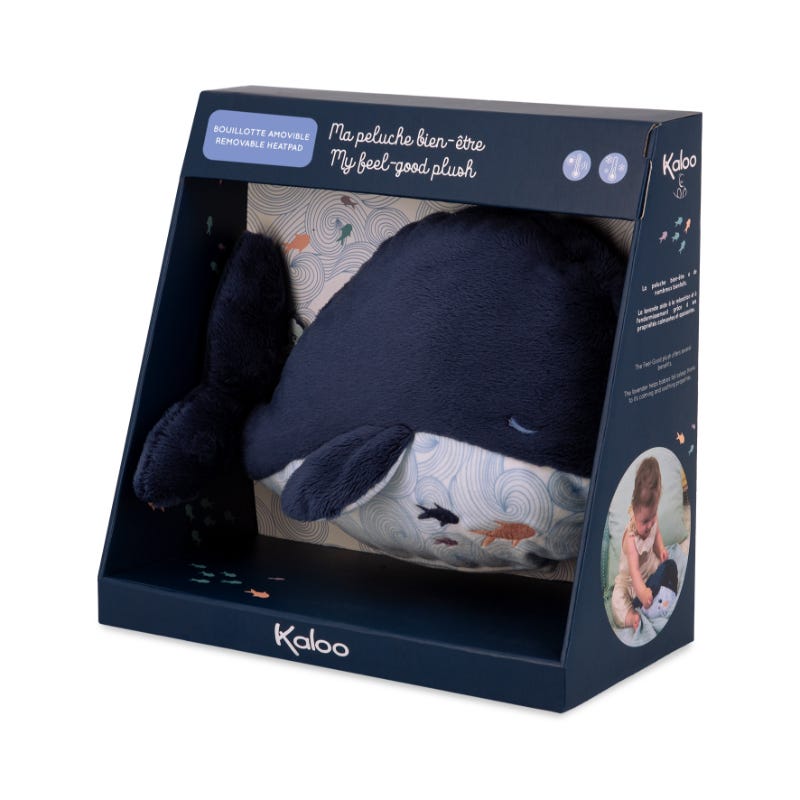 La peluche bien-être en forme de baleine est la peluche idéale pour soulager bébé de ses petits maux. Cette peluche est déhoussable et contient une poche amovible. La poche garnie de billes en argile et fleurs de lavande est à placer au micro-ondes ou au congélateur pour un effet chaud ou froid. L'accès à la poche est sécurisé grâce à un système de velcros pour une utilisation sans risques. En fourrure bleue toute douce, elle saura donner à bébé apaisement et relaxation. Son ventre est habillé d'un imprimé Danse des vagues agrémenté de broderies de poissons qui rappellent le calme des profondeurs marines et l'onde de douceur et de bien-être apportées par la peluche. Sa taille généreuse est idéale pour réchauffer votre enfant dans son lit et l'apaiser. Sans poche, elle s’utilise comme peluche câlin. C'est la peluche bien-être préférée de bébé. La bouillote offre de nombreux bienfaits notamment le soulagement temporaire des douleurs. La lavande aide à l'endormissement grâce à ses propriétés calmantes et apaisantes. Veuillez retirer la poche avant lavage en machine. Mode d'emploi inclut à l'intérieur de la peluche. Dimensions : 17 cm