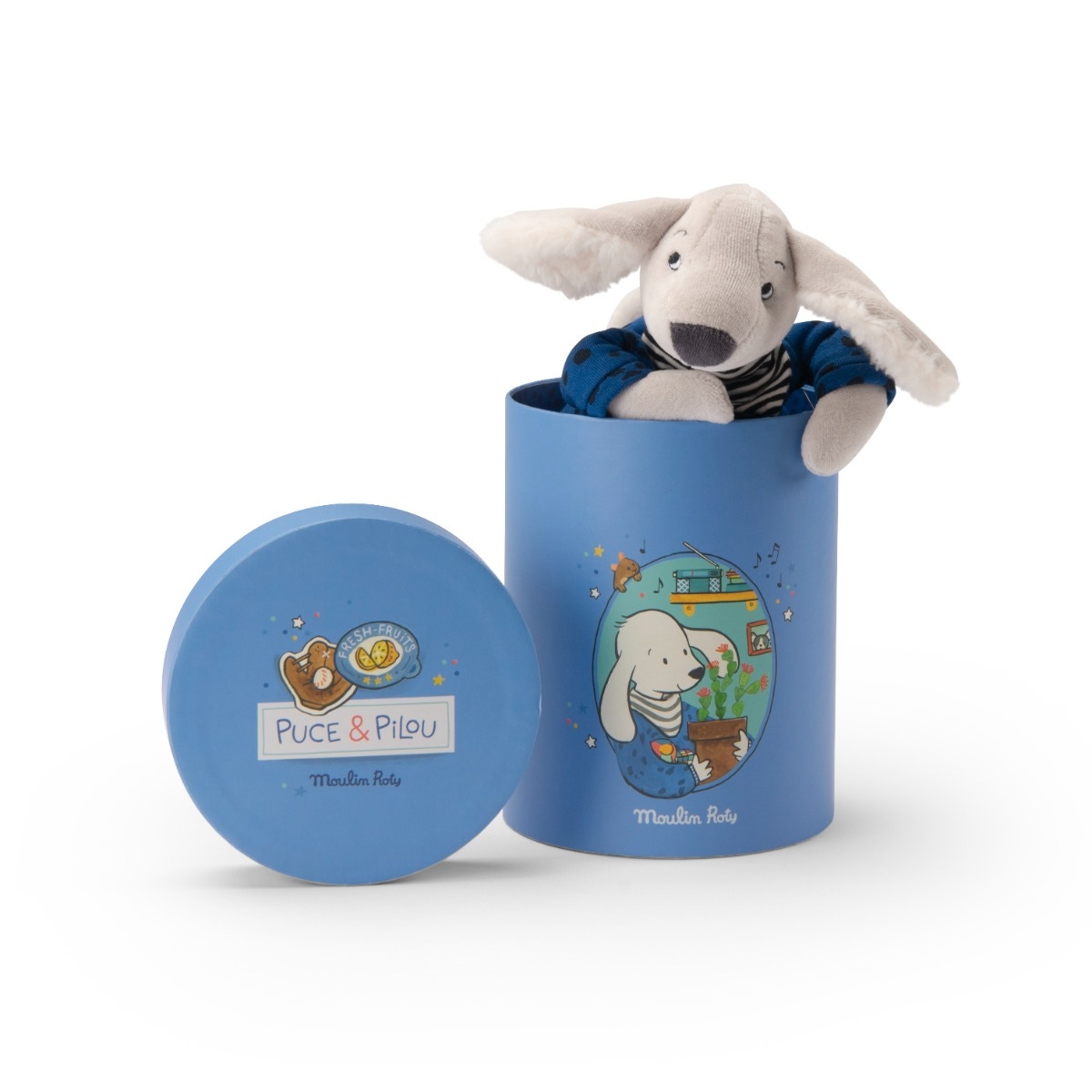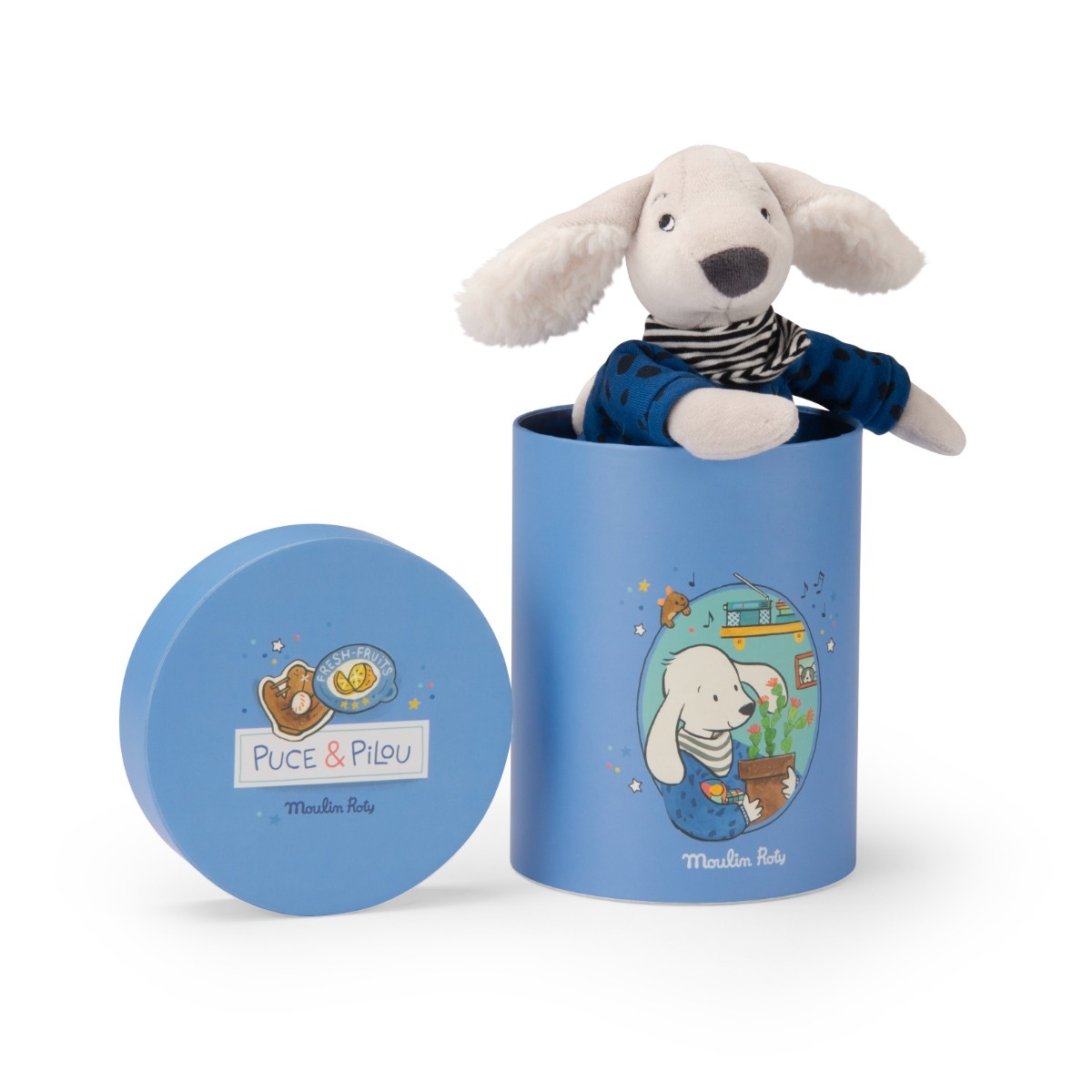 Découvrez la peluche Moulin Roty chien Pilou bleu de la collection Puce & Pilou Moulin Roty. Tendre et de taille idéale pour les petits bras, Pilou est le compagnon parfait pour des câlins tout doux et facile à emporter partout. Il est présenté dans une jolie boîte ronde illustrée.