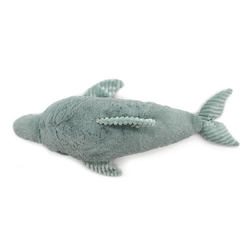 La peluche dauphin Ptipotos de 50 cm couleur vert menthe est vendue avec son bébé caché dans son ventre.