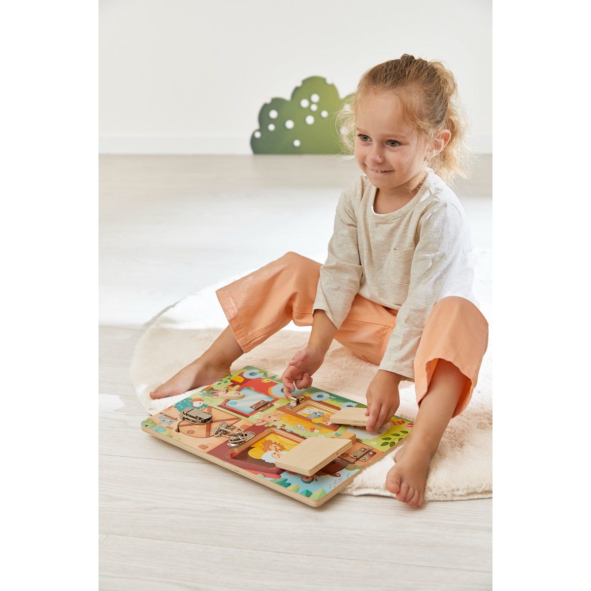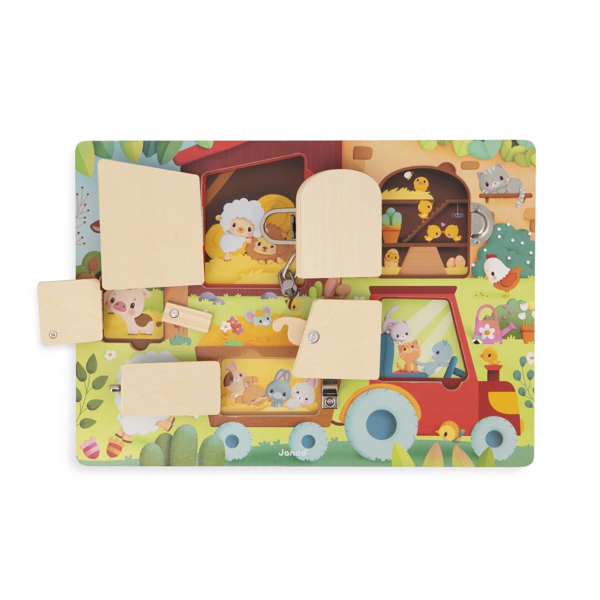 Découvrez la Planche à verrous Janod, un jouet en bois ludique qui plonge les enfants dans le monde de la ferme. Avec ses 5 portes aux systèmes d’ouverture différents (crochet, loquet, entrebâilleur, bascule et verrou), chaque ouverture révèle des bébés animaux et un chiffre correspondant, pour apprendre à compter en s’amusant.
