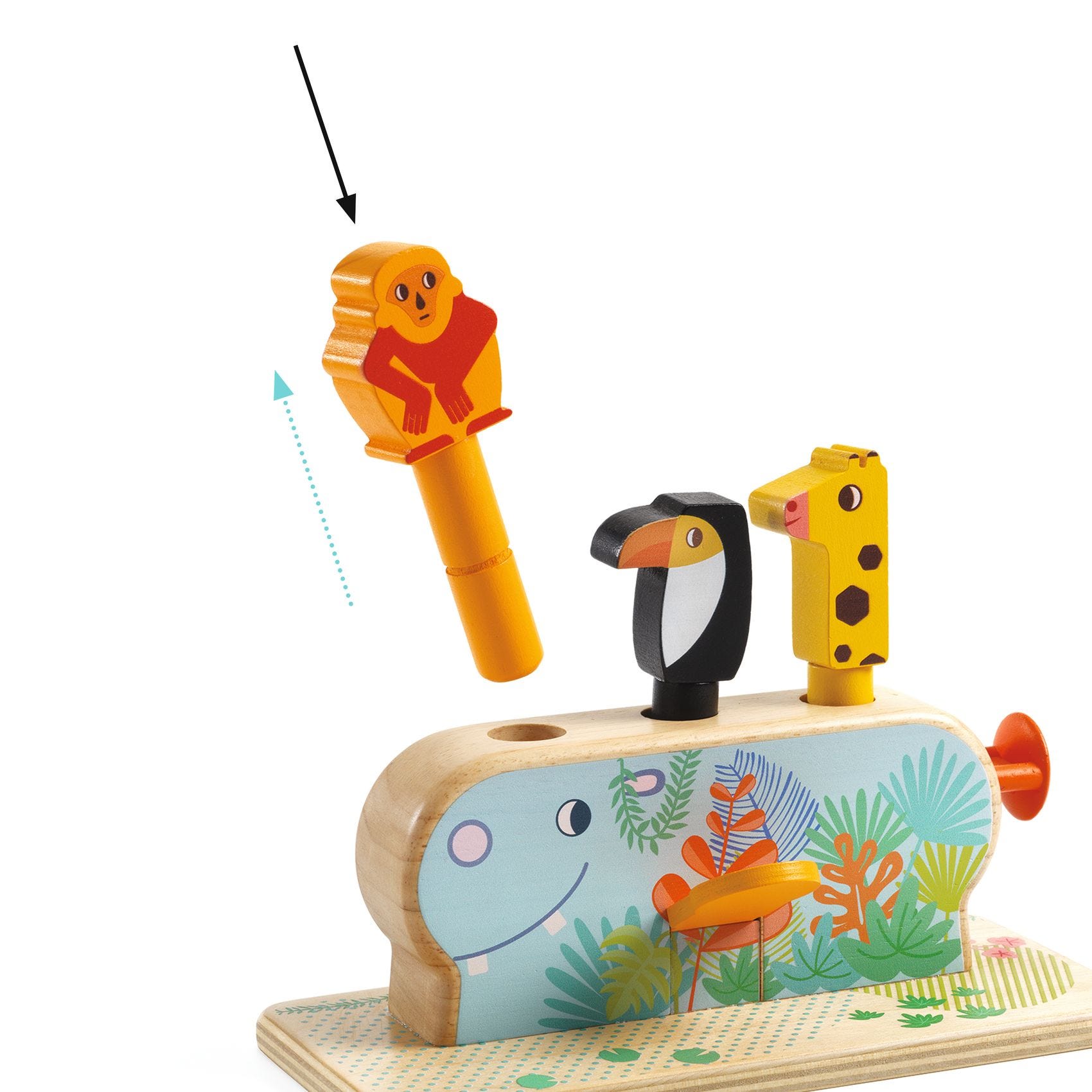 Multi Pop est un jouet en bois qui permet à l'enfant de découvrir 3 manières différentes de faire sauter les animaux. L'enfant appuie sur le singe pour le faire bondir, il tape sur le levier pour faire sauter le toucan, et il pousse le poussoir pour faire jaillir la girafe.