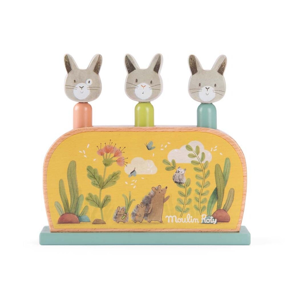 Pop up en bois composé d'un socle et de 3 personnages de la collection Trois petits lapins, prêts à sauter partout ! Jouet d'éveil qui consiste à placer les personnages dans les trous et appuyer sur leur tête pour les faire bondir.