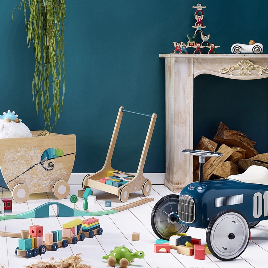 Porteur voiture vintage en métal. Couleur bleu pétrol. À partir de 18 mois. A monter soi-même
