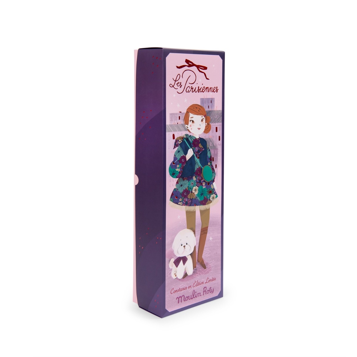 Épatante Constance en édition limitée ! Robe fleurie, gilet de fourrure et bottes à boucles dorées, elle émerveille par son originalité. Poupée Les Parisiennes au doux visage brodé et sérigraphié, présentée dans un coffret illustré par Lucille Michieli.