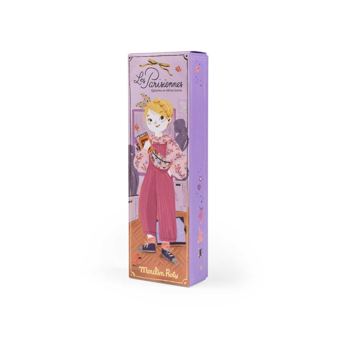 Créative Églantine en édition limitée ! Grand col fleuri, salopette de velours et banane assortie, elle resplendit. Poupée Les Parisiennes au doux visage brodé et sérigraphié, présentée dans un coffret illustré par Lucille Michieli.