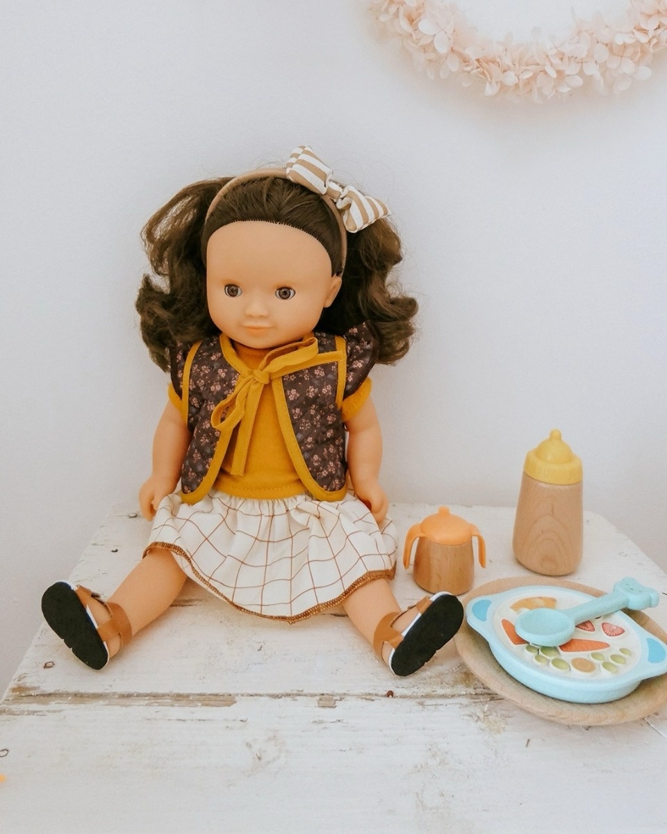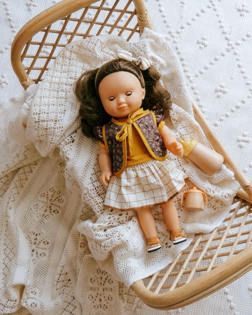 Rosalie est habillée d’une charmante combinaison en coton gaufré à manches courtes volantées, accompagnée d’un serre-tête assorti et de petites sandales adorables. Une poupée pleine de grâce qui deviendra vite la meilleure amie des enfants.