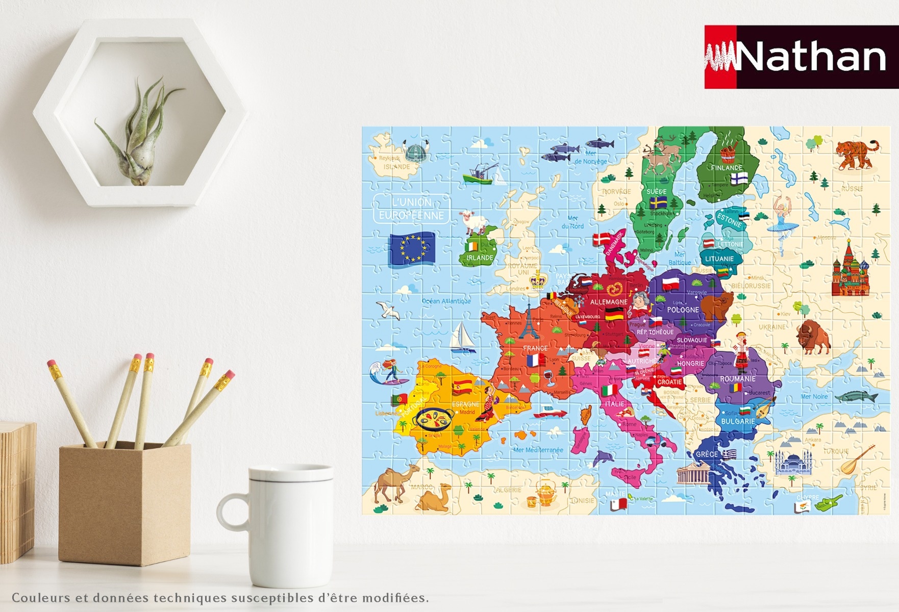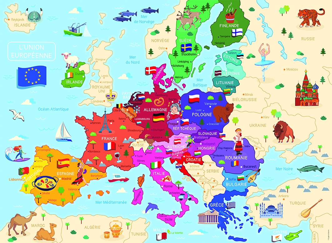 Les illustrations colorées et détaillées représentent chaque pays avec ses principales villes, spécialités ou monuments emblématiques, pour une immersion complète dans la richesse culturelle de l’Europe. Un excellent support pour apprendre à situer les pays sur la carte tout en s’amusant à assembler les pièces.