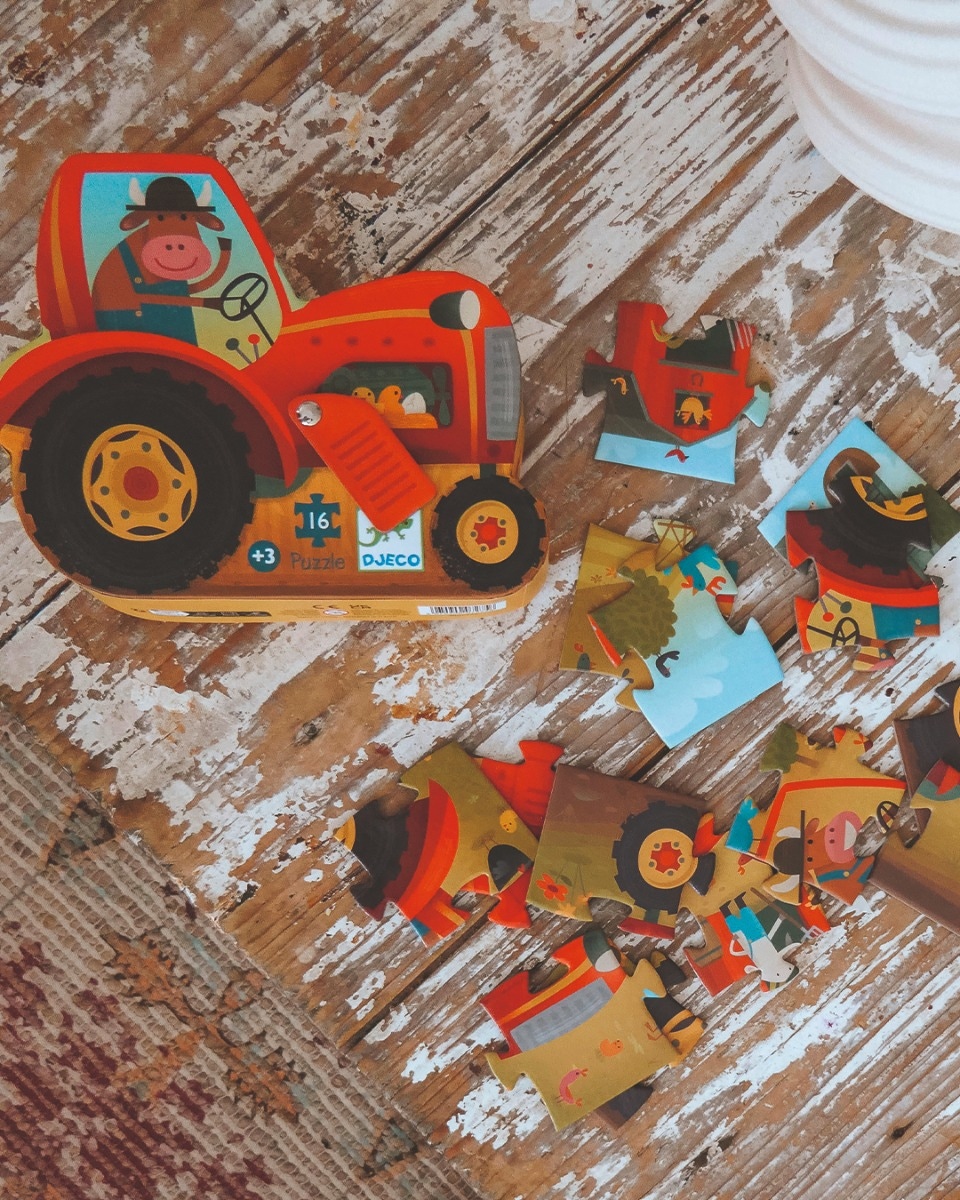 Puzzle silhouette tracteur de 16 pièces de la marque Djeco. Le tracteur est de retour à la ferme après avoir travaillé aux champs. Ce puzzle coloré est présenté dans une jolie boîte silhouette en forme de tracteur pour décorer la chambre de votre enfant. Les pièces sont épaisses pour faire et défaire à volonté.