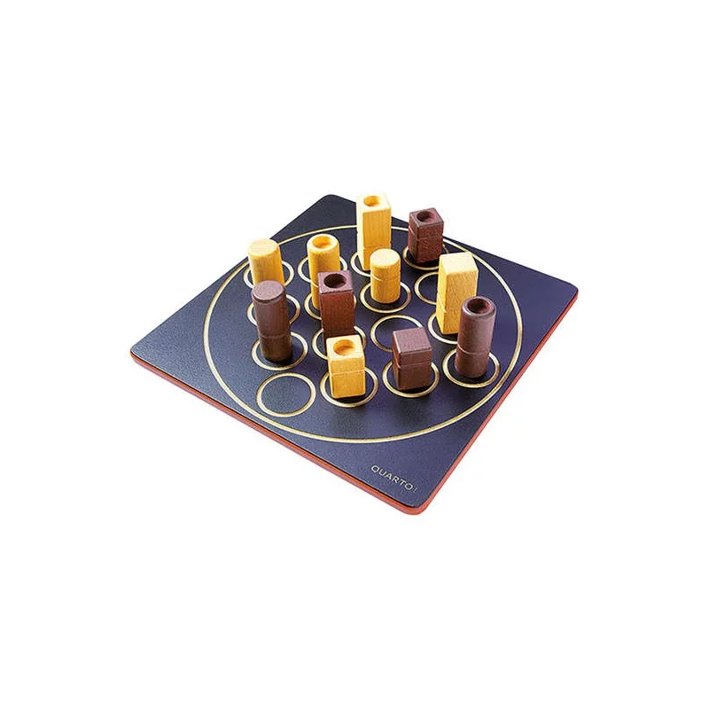 L'objectif : aligner 4 pièces ayant au moins un point commun entre elles. Mais ne croyez pas que vous jouerez celles que vous voudrez : c'est l'adversaire qui choisit pour vous ! Les seize pièces du jeu, toutes différentes, possèdent chacune 4 caractères distincts : haute ou basse, ronde ou carrée, claire ou foncée, pleine ou creuse. Chacun à son tour choisit et donne une pièce à l'adversaire, qui doit la jouer sur une case libre. Le gagnant est celui qui, avec une pièce reçue, crée un alignement de 4 pièces ayant au moins un caractère commun et annonce : "QUARTO !".