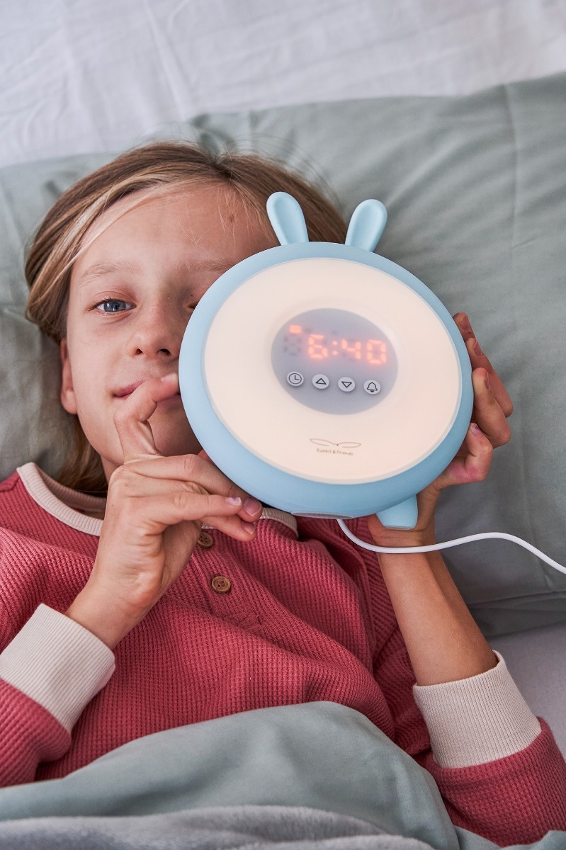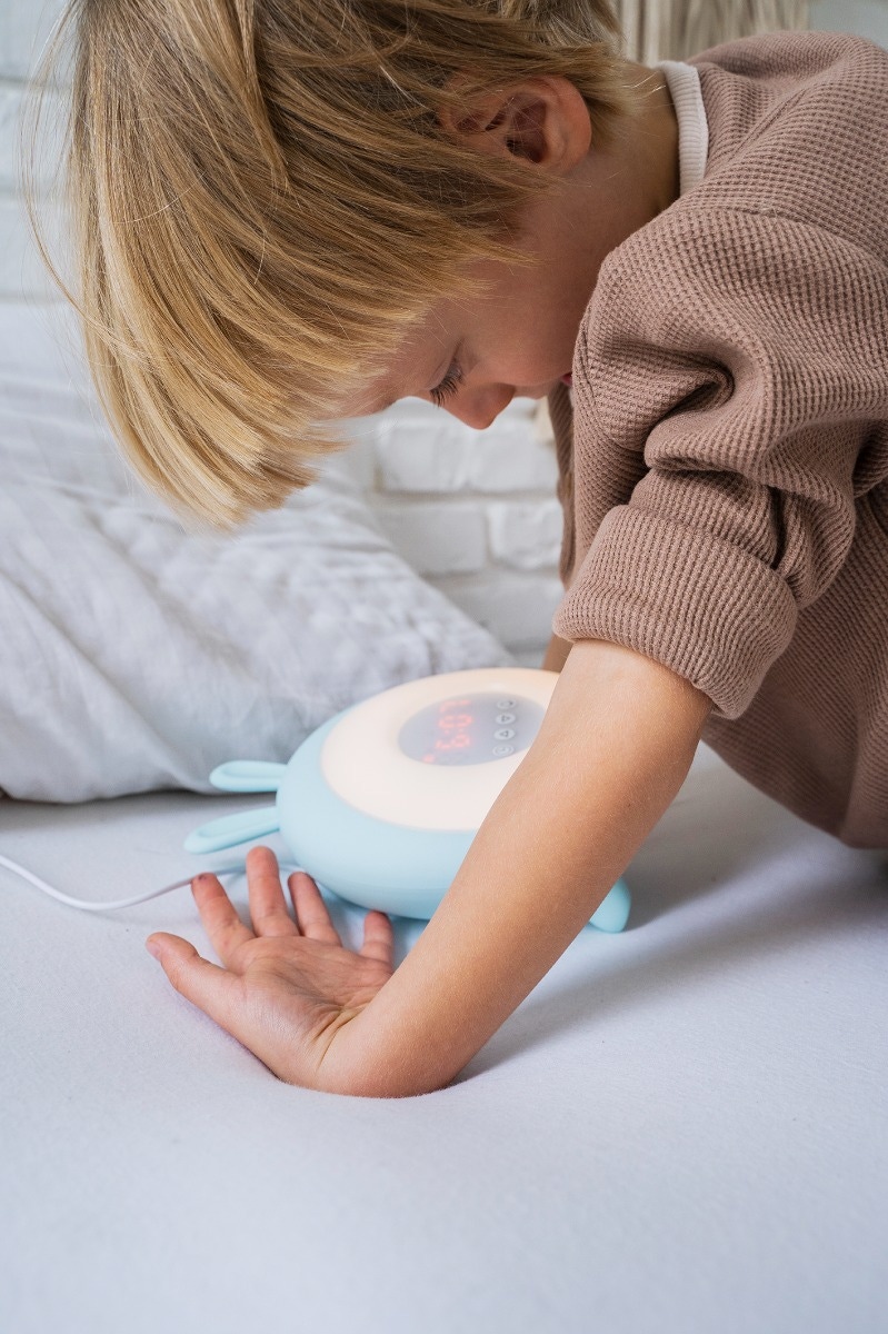 Découvrez Le réveil lapin lumineux bleu de Rabbit & Friends. Nous savons tous combien il est difficile de se réveiller, surtout pour les enfants. Il fait encore sombre à la maison et il est difficile pour eux de se lever et de commencer une nouvelle journée. Rabbit & Friends a répondu à ces attentes en créant un produit qui facilite le réveil quotidien. La lampe de réveil s'allume 30 minutes avant l'alarme principale avec une lumière douce dont l'intensité augmente progressivement. Elle imite le lever du soleil, ce qui aide à se réveiller en douceur. De plus, 15 minutes avant l'alarme principale, une pré-alarme sonne à 50% de son intensité, stimulant davantage le corps à se réveiller. Pour les plus résistants, une fonction snooze est également disponible après le son de l'alarme principale.