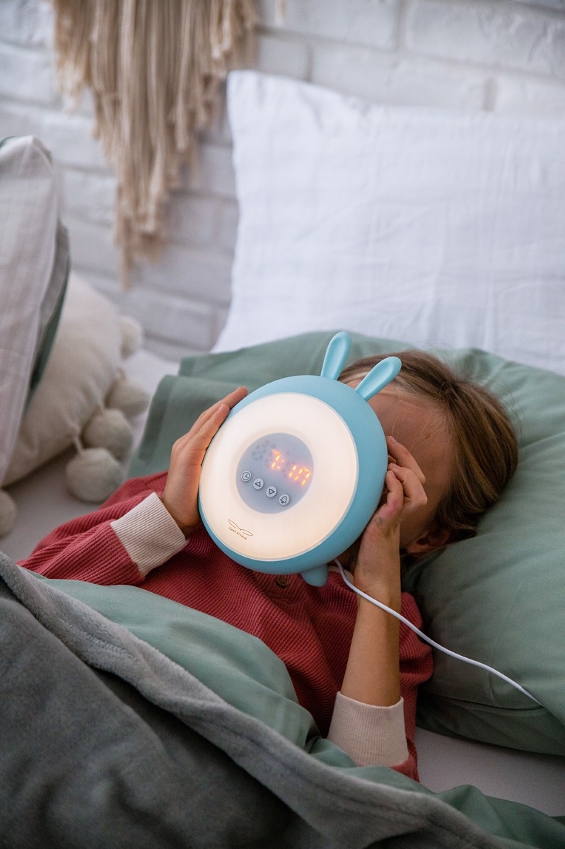 Nous proposons 5 sons au choix, dont 2 sons de la nature (mer et bulles). Notre lapin, en plus d'afficher l'heure et de servir de réveil, est aussi une lampe dont l'intensité et la couleur peuvent être modifiées (8 couleurs).