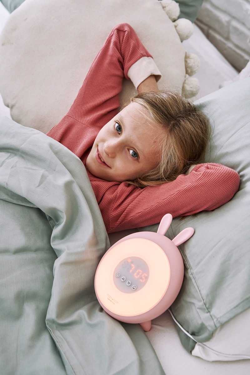 Découvrez Le réveil lapin lumineux rose de Rabbit & Friends. Nous savons tous combien il est difficile de se réveiller, surtout pour les enfants. Il fait encore sombre à la maison et il est difficile pour eux de se lever et de commencer une nouvelle journée. Rabbit & Friends a répondu à ces attentes en créant un produit qui facilite le réveil quotidien. La lampe de réveil s'allume 30 minutes avant l'alarme principale avec une lumière douce dont l'intensité augmente progressivement. Elle imite le lever du soleil, ce qui aide à se réveiller en douceur. De plus, 15 minutes avant l'alarme principale, une pré-alarme sonne à 50% de son intensité, stimulant davantage le corps à se réveiller. Pour les plus résistants, une fonction snooze est également disponible après le son de l'alarme principale.