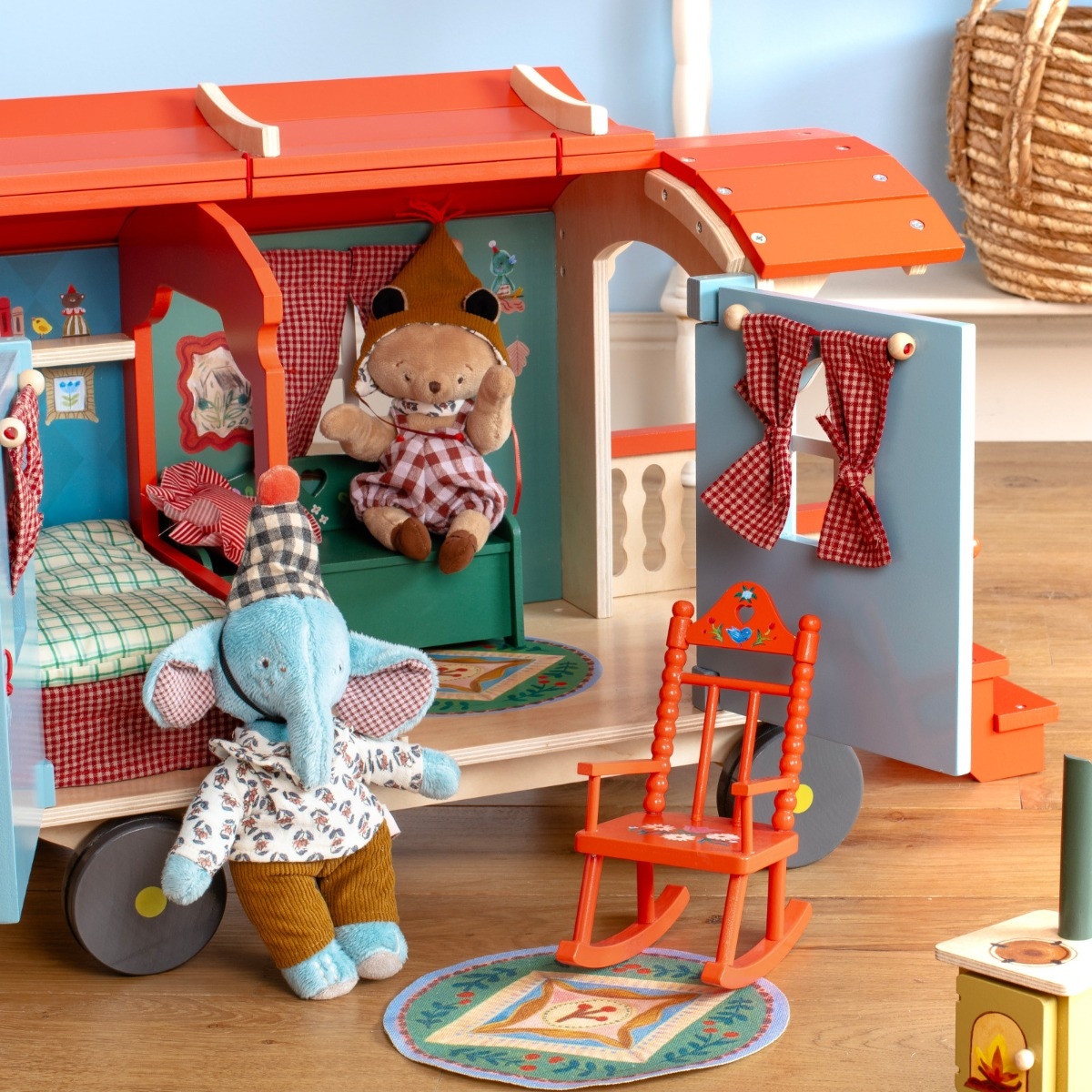 Ce soir, c’est soirée magique dans la roulotte en bois des Minouchkas par Moulin Roty ! Tandis que la douce Rita arrive avec ses délicieuses crêpes au sucre, l’intrépide Léon sort ses livres d’aventures, et la pétillante Nine s’installe avec son tricot... Tout est prêt pour une veillée d’été pleine de rires et d’histoires à partager ! Une invitation au jeu tendre et poétique, à partir de 3 ans. Personnages vendus séparément.