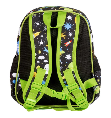 Le sac à dos noir pratique avec des fusées, des planètes et des étoiles est idéal pour l'école ou les voyages. Le sac à dos pour enfants dispose d'un compartiment principal spacieux, d'une poche avant isolée et de deux poches latérales ouvertes ; assez grand pour une boîte à lunch, une collation et une bouteille d'eau. Le sac à dos comporte des bretelles rembourrées et une sangle de poitrine, de sorte qu'il ne glisse pas facilement des épaules. Le panneau arrière est doublé d'un tissu respirant pour plus de confort.