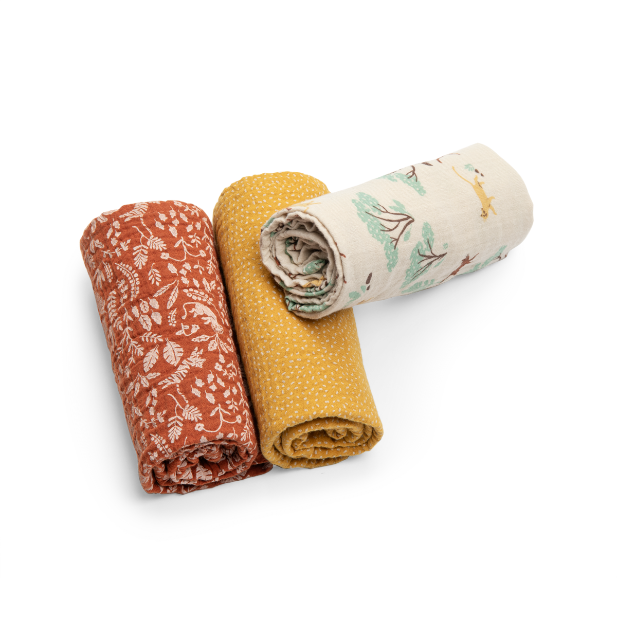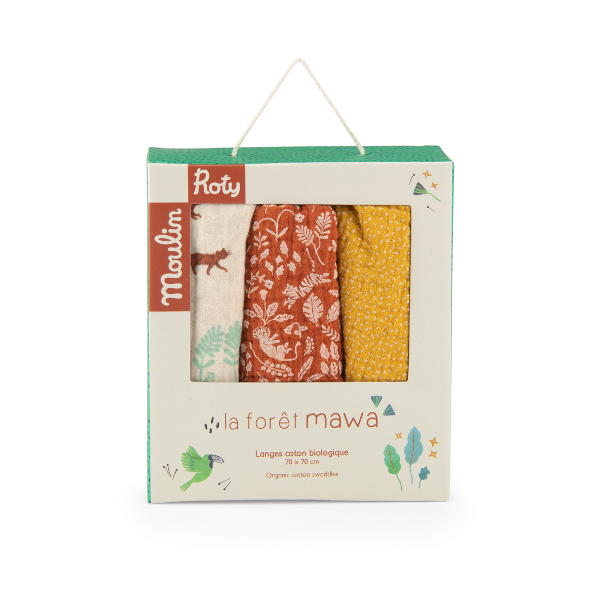 Découvrez le set de 3 langes imprimés La forêt Mawa de Moulin Roty, parfaits pour accompagner bébé au quotidien.