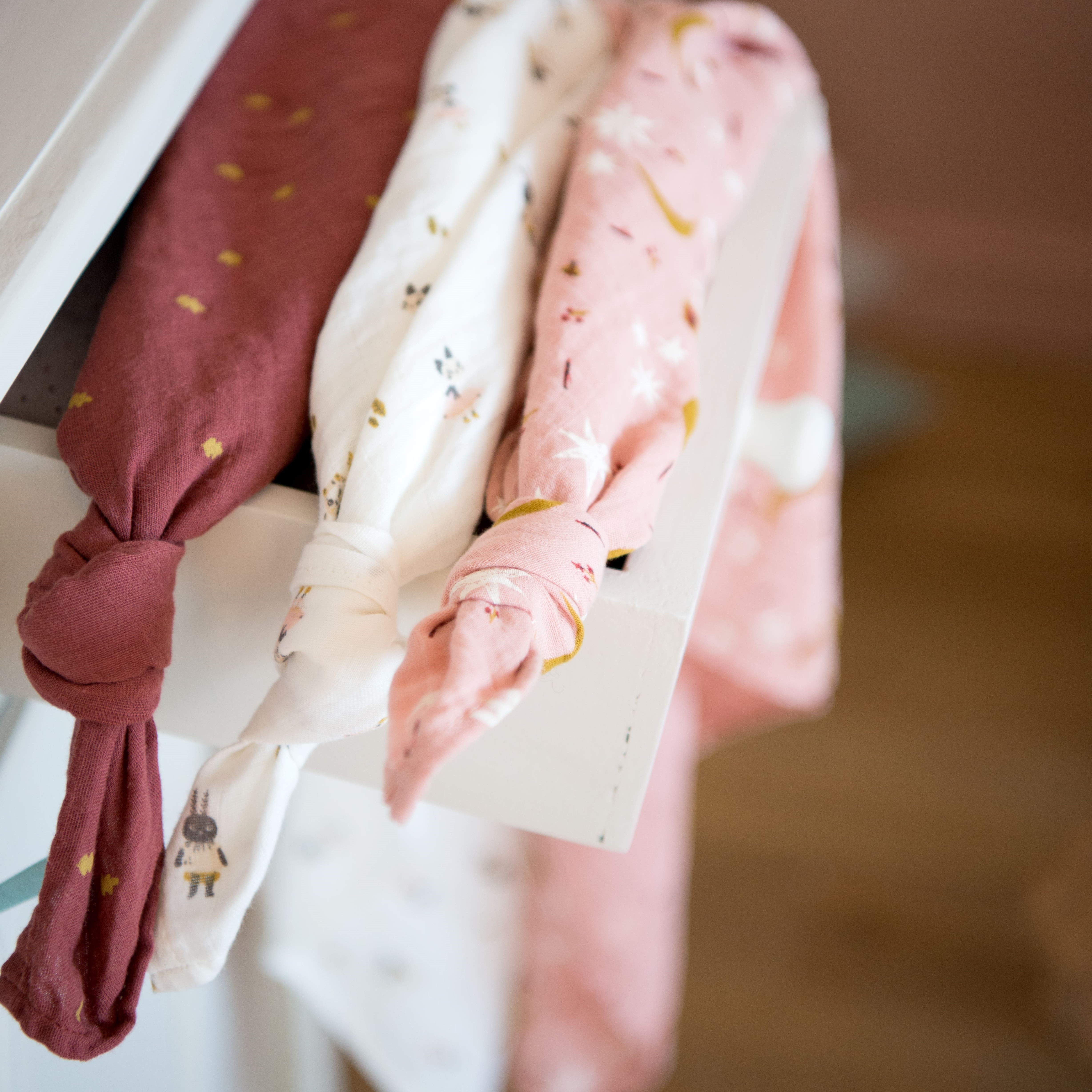 Set de 3 langes en coton biologique, souples et légers pour changer bébé ou l'envelopper de douceur pendant les balades… Ils sont imprimés des illustrations poétiques d'Après la pluie, avec 1 lange brodable au prénom de l'enfant.