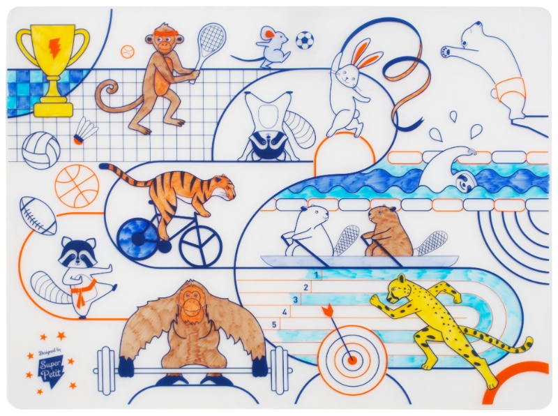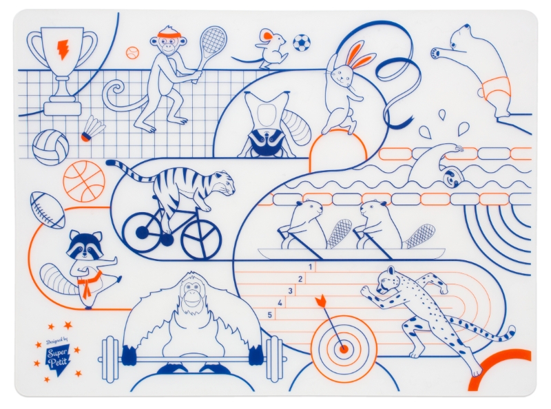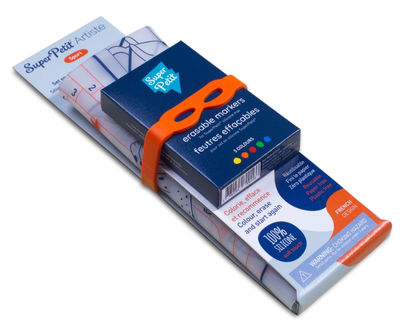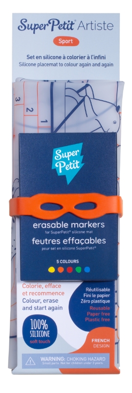 Nos athlètes SuperPetit sont prêts pour les Jeux Olympiques. Amuse-toi à colorier le sport que tu préfères et rejoins la compétition. En avant, prêts, partez ! Colorie, efface recommence ! Voici le SuperPetit artiste : un set ludique en silicone tout doux à colorier à l’infini avec ses 5 feutres lavables et aux encres non toxiques. On adore le dessin créatif et rigolo qui accompagnera votre enfant à table, avec des graphismes signés SuperPetit. Ce set très facilement pliable occupera votre petit artiste dans tous ses déplacements et peut être également détourné pour des ateliers créatifs : peinture à l’eau, pâte à modeler, cuisine... Ludique et créatif, ce set de coloriage réutilisable stimule l'imaginaire des enfants de tout âge. La matière 100% silicone alimentaire est douce et agréable. Cette marque française s'engage pour la défense de l'environnement et reverse 1% de ses ventes à des associations. Le petit plus : le bracelet en forme de masque que votre SuperPetit héros pourra porter fièrement !