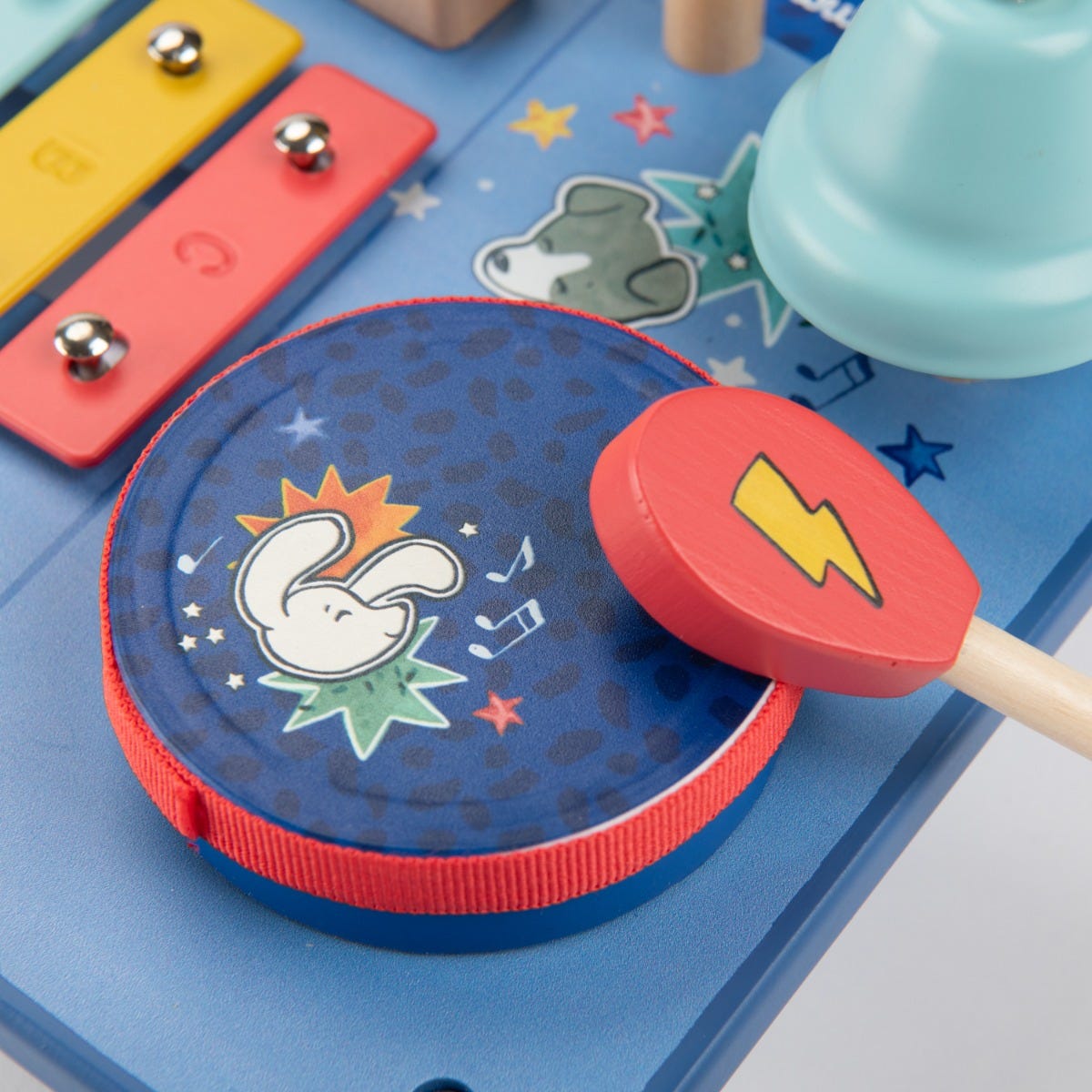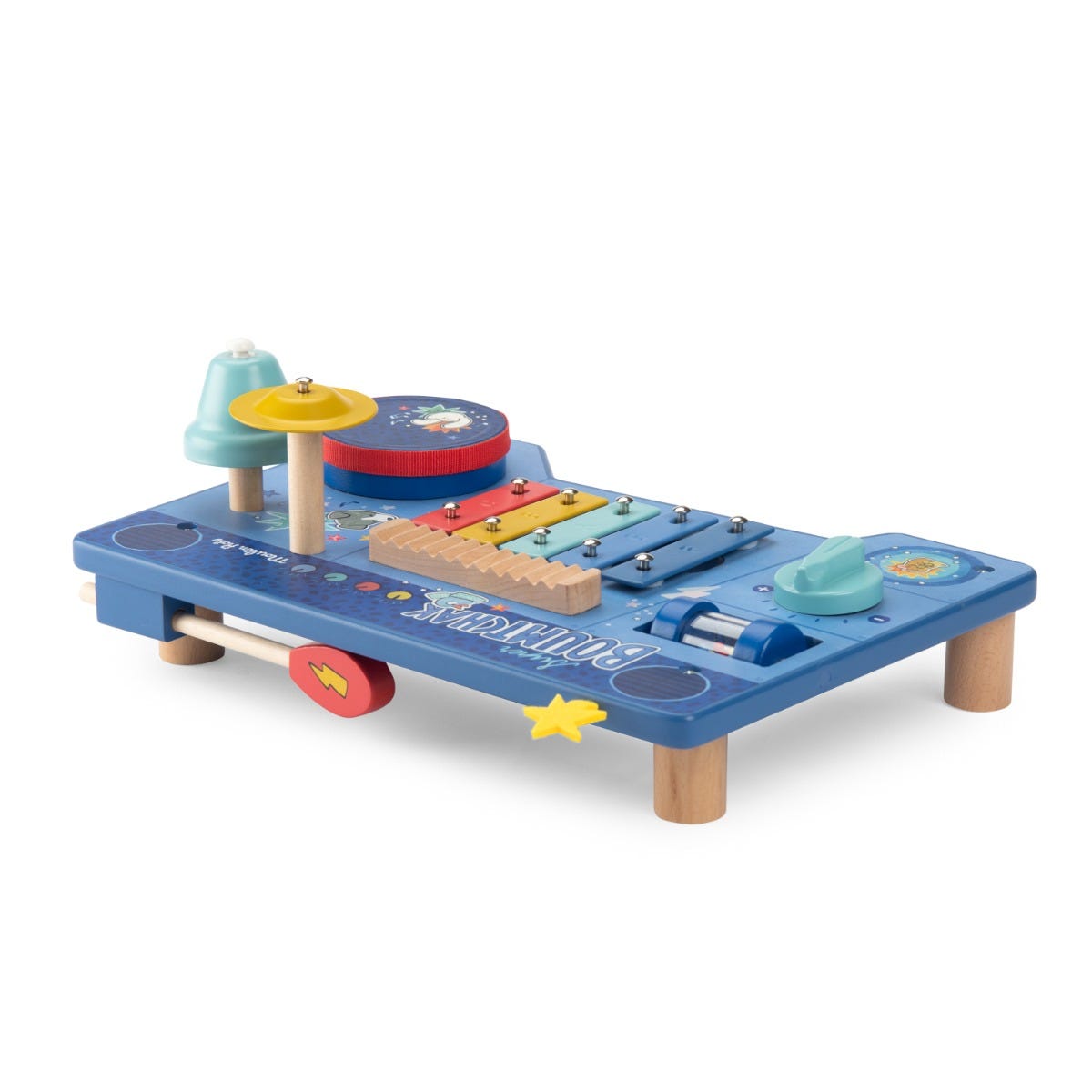 Le super boumtchak de Puce & Pilou est arrivé ! Taper sur le tambour, monter le volume, secouer les billes, faire tinter la cymbale…Une multitude d'activités à découvrir pour bébé. En bois et illustré, cette table musicale est facilement transportable.