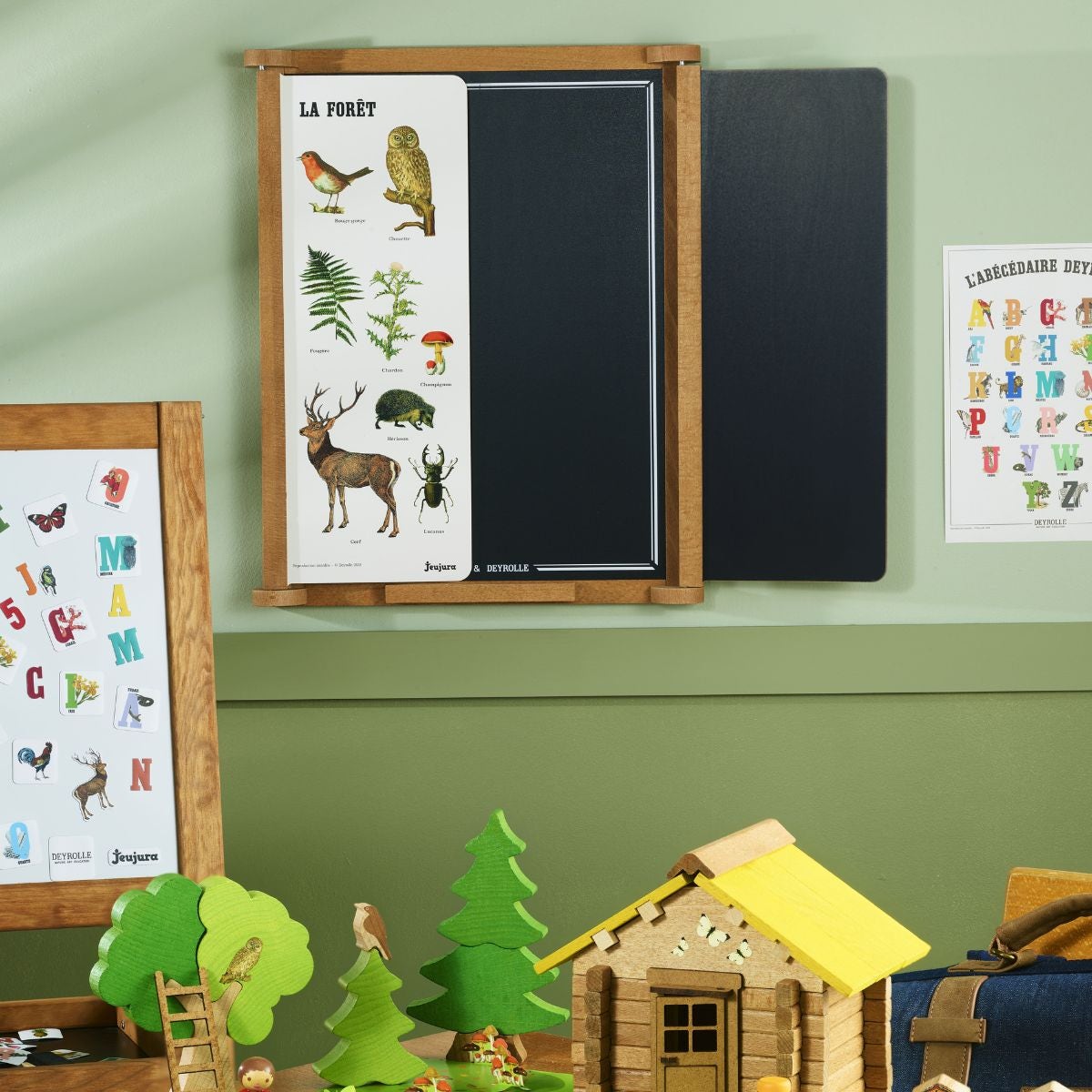Tableau Triptyque 'La Forêt' : Tableau en bois teinté chêne avec une ardoise centrale pour écrire à la craie et deux volets avec une face pour la craie et une face avec une planche pédagogique Deyrolle ‘La Forêt’. Plumier en bois et accessoires : boîte de 3 craies et brosse à tableau. Dimensions du produit ouvert : 82 x 56 (hauteur) cm, fermé : 43 x 56 (hauteur) cm. A partir de 3 ans