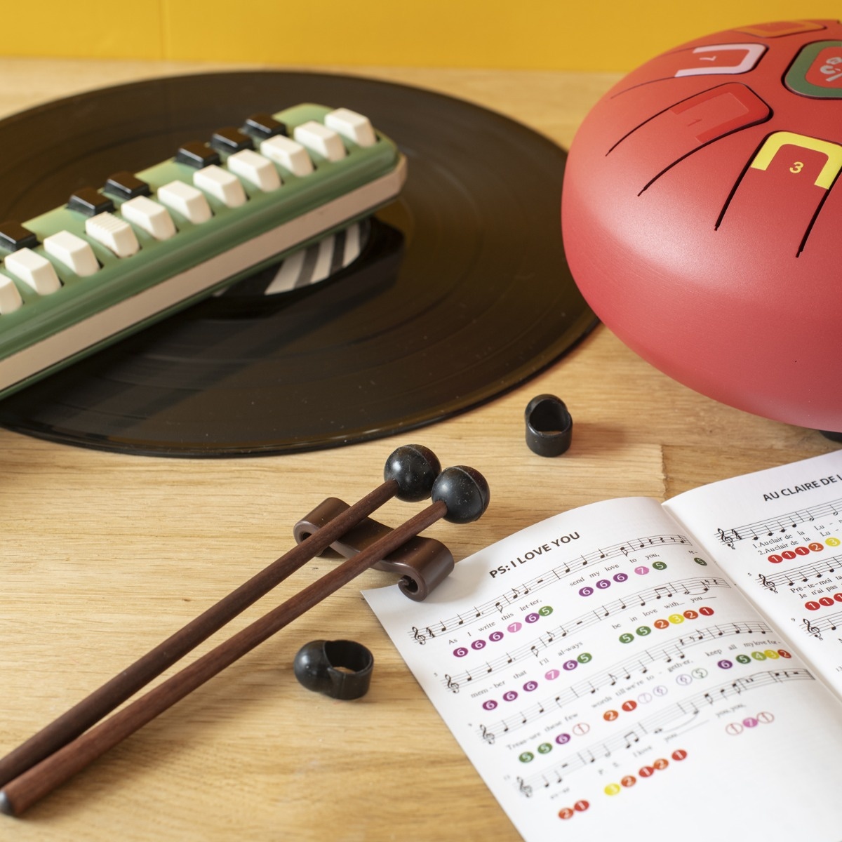 Avec ses 11 notes joliment repérées par des couleurs et des chiffres, ce tambour invite à explorer les sons de mille façons : du bout des doigts, avec les mains, ou grâce aux baguettes incluses. Et pour encore plus de fun, 4 pics à doigts et un livret de mélodies viennent compléter l’expérience.