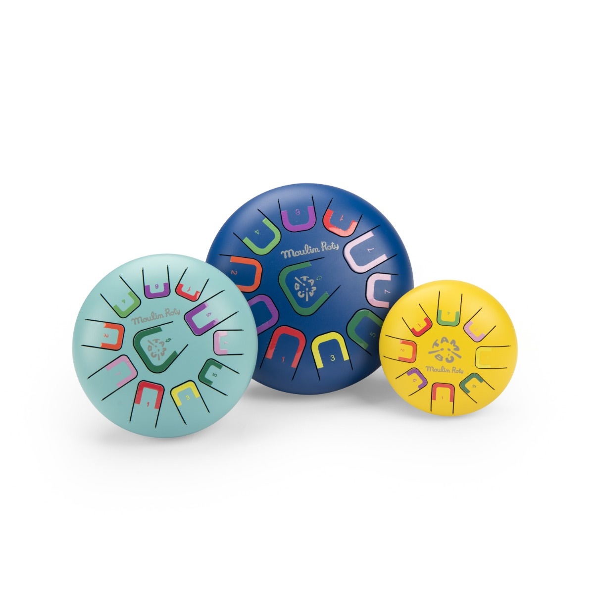 Ce tambour en métal bleu est prêt à accompagner bébé dans ses premières découvertes sonores. Facile à utiliser grâce à ses languettes musicales à frapper avec les mains ou les baguettes fournies, il produit des sons mélodieux qui raviront petits et grands.