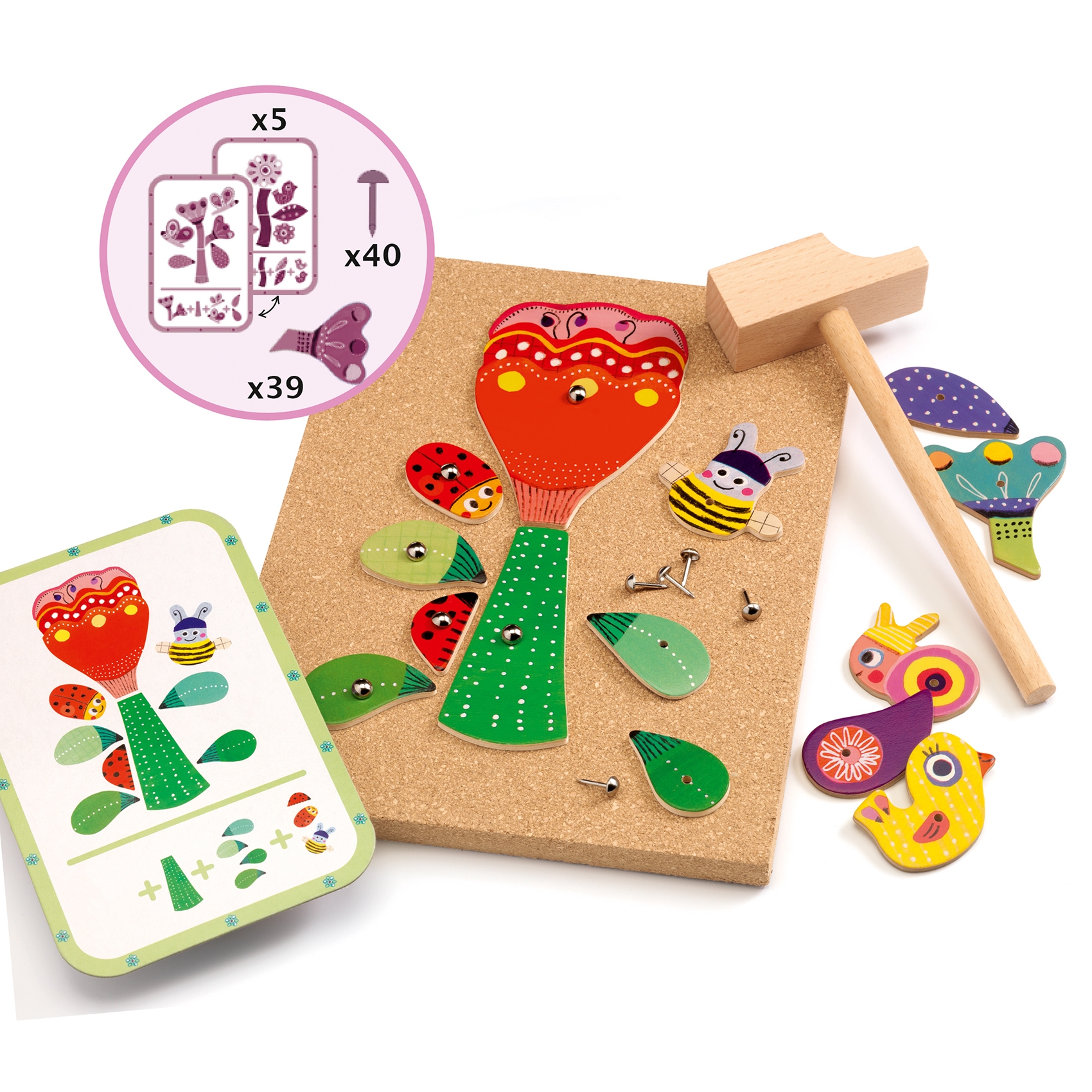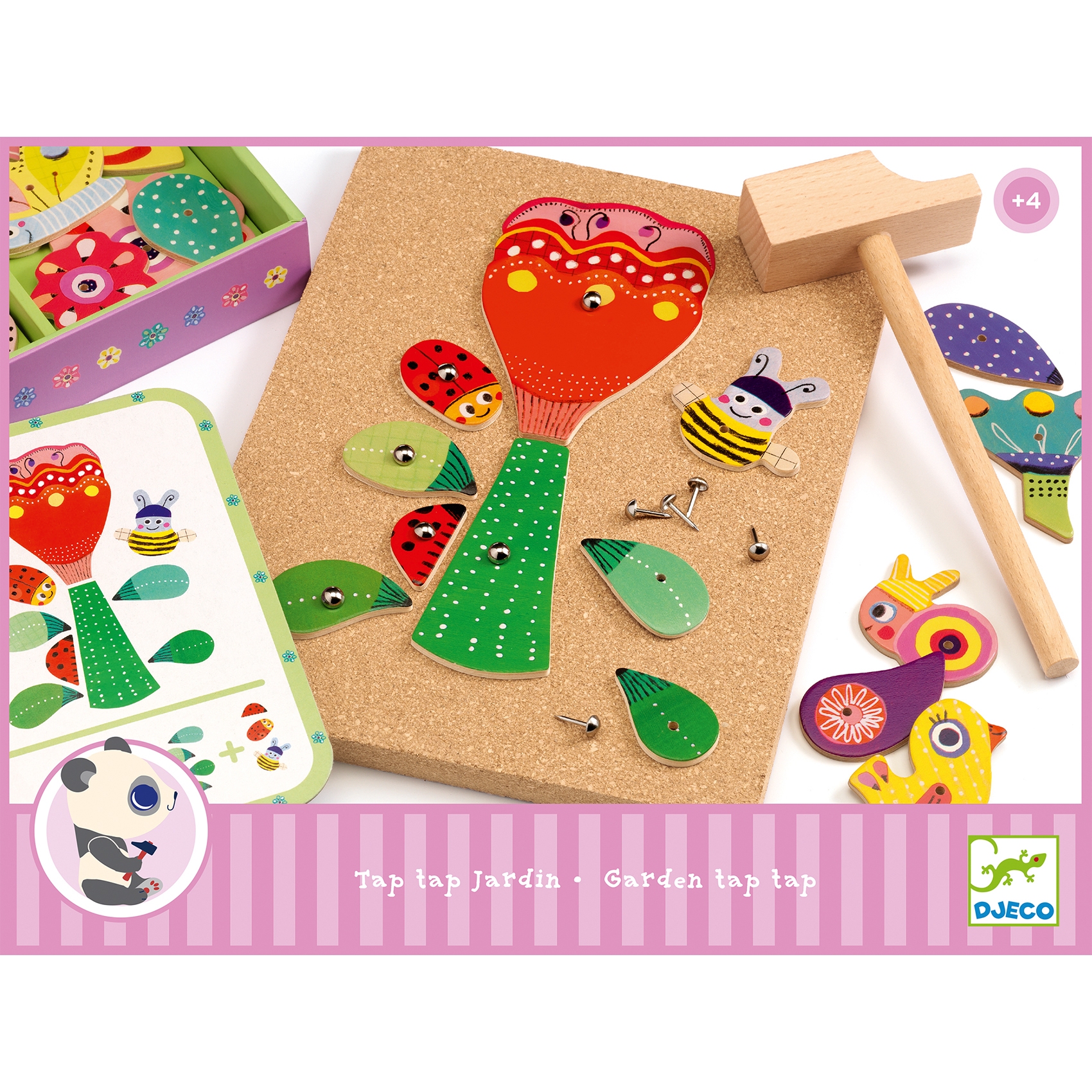 Tap tap jardin, un classique des activités de maternelle revisité par Djeco pour développer la dextérité des plus jeunes. L'enfant construit ses propres fleurs et jardins en plaçant les pièces sur le support en liège et en les fixant à l'aide des petits clous et du marteau. Il reproduit les modèles ou fait appel à son imagination pour créer un beau jardin ! Le tout dans une jolie boîte en bois !