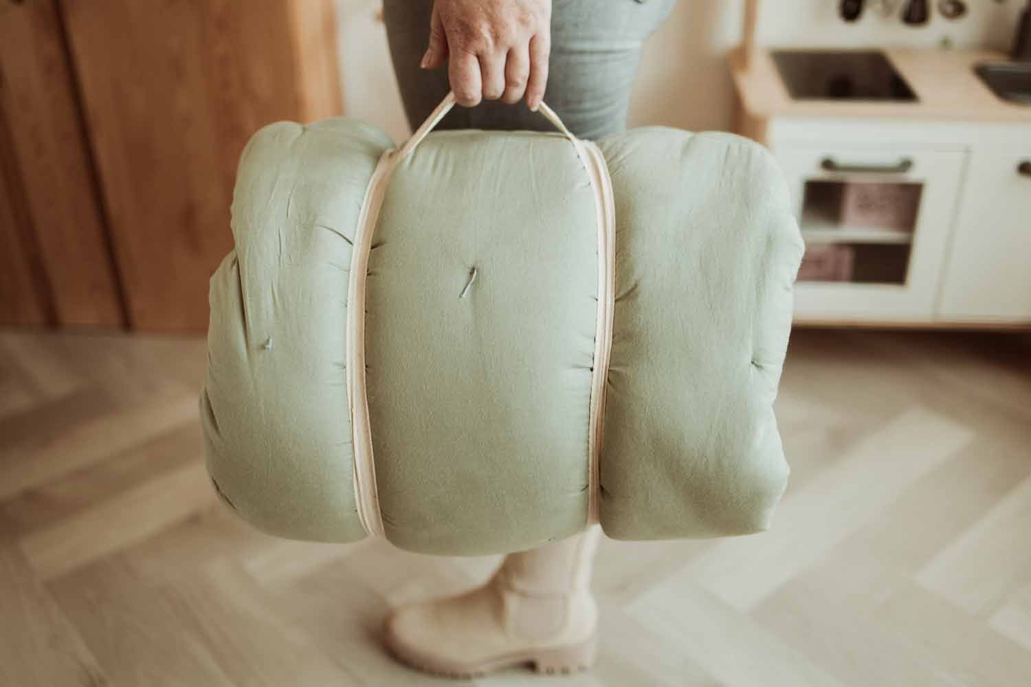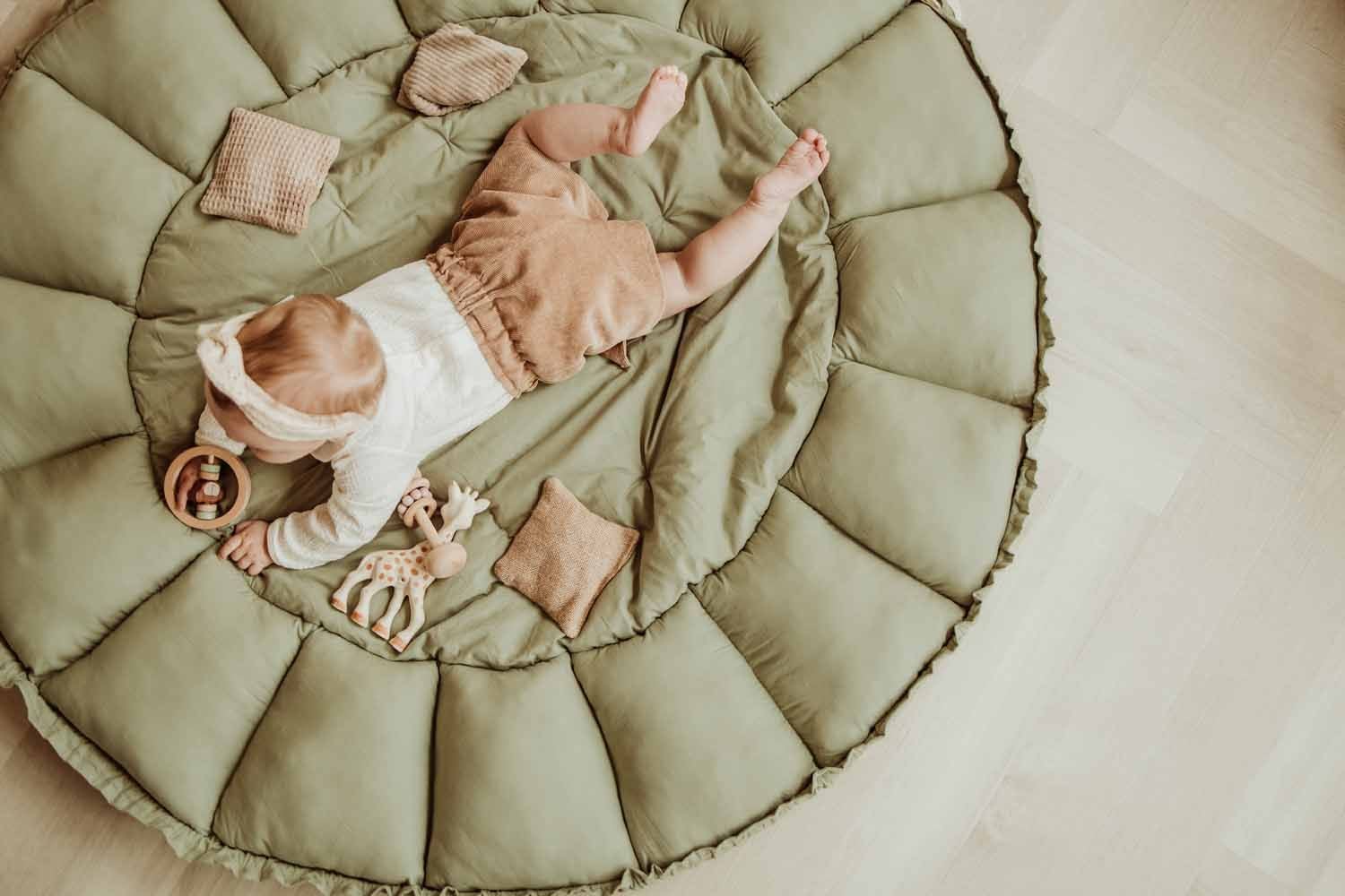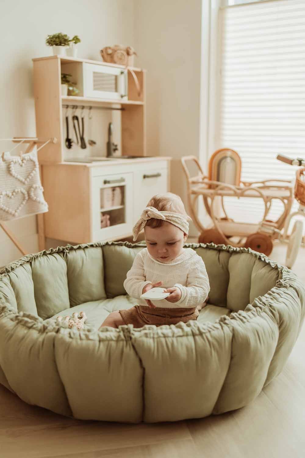 Ce tapis de jeu Bloom vert à bords relevables est la dernière nouveauté de la marque Play&Go. Lorsqu’il est ouvert à plat, c’est un tapis d’éveil est en forme de fleur où bébé peut être installé avec ses jouets préférés. Lorsque les « pétales » sont relevées, il se transforme en couffin moelleux pour faire la sieste. Le format de ce tapis une fois roulé permet de le transporter facilement et d’avoir un tapis de jeu et un berceau pour dormir lorsque vous n’êtes pas chez vous. Les bords se relèvent rapidement en tirant sur une sangle. Lorsque votre enfant ne s’en sert pas, le couffin peut servir de rangement pour stocker les peluches et les jeux de bébé. Très confortable, ce tapis est fabriqué en coton biologique et se lave en machine en cycle délicat. Ce parc et berceau design épuré permettra à votre bébé d’être confortablement installé pour jouer et dormir partout où vous allez.