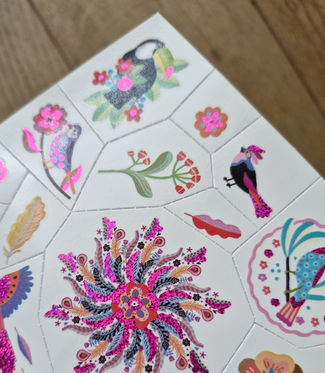 Deux planches de tatouages temporaires sur le thème des oiseaux. Des illustrations raffinées pleines de détails et de poésie, parsemées d'enluminures métallisées roses pour magnifier leur plumage. Faciles à utiliser, ces tatouages temporaires sont prédécoupés et s'appliquent avec un peu d'eau.