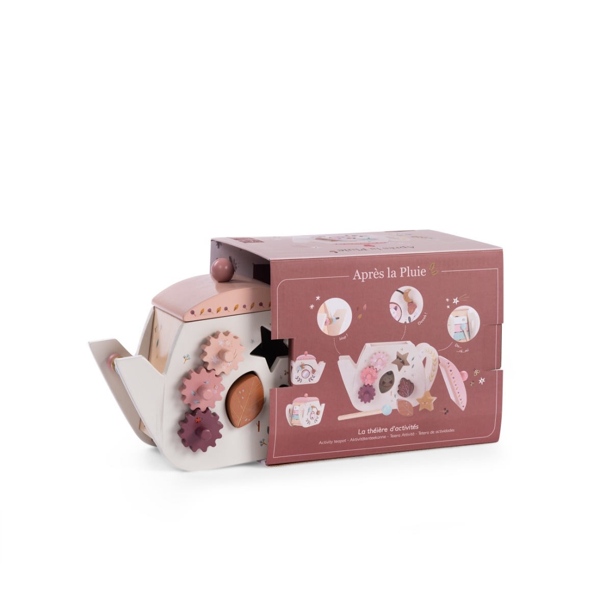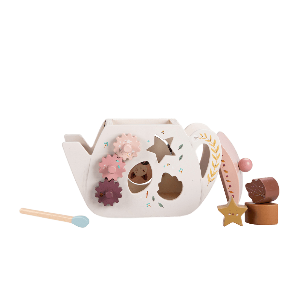 En voilà une jolie théière d'activités en bois pour bébé ! Chacune des 4 faces lui promet de jolies découvertes de jeux et d'apprentissages : boulier, formes à encastrer, roues dentées à faire tourner, xylophone… Il y a même un petit miroir dissimulé!