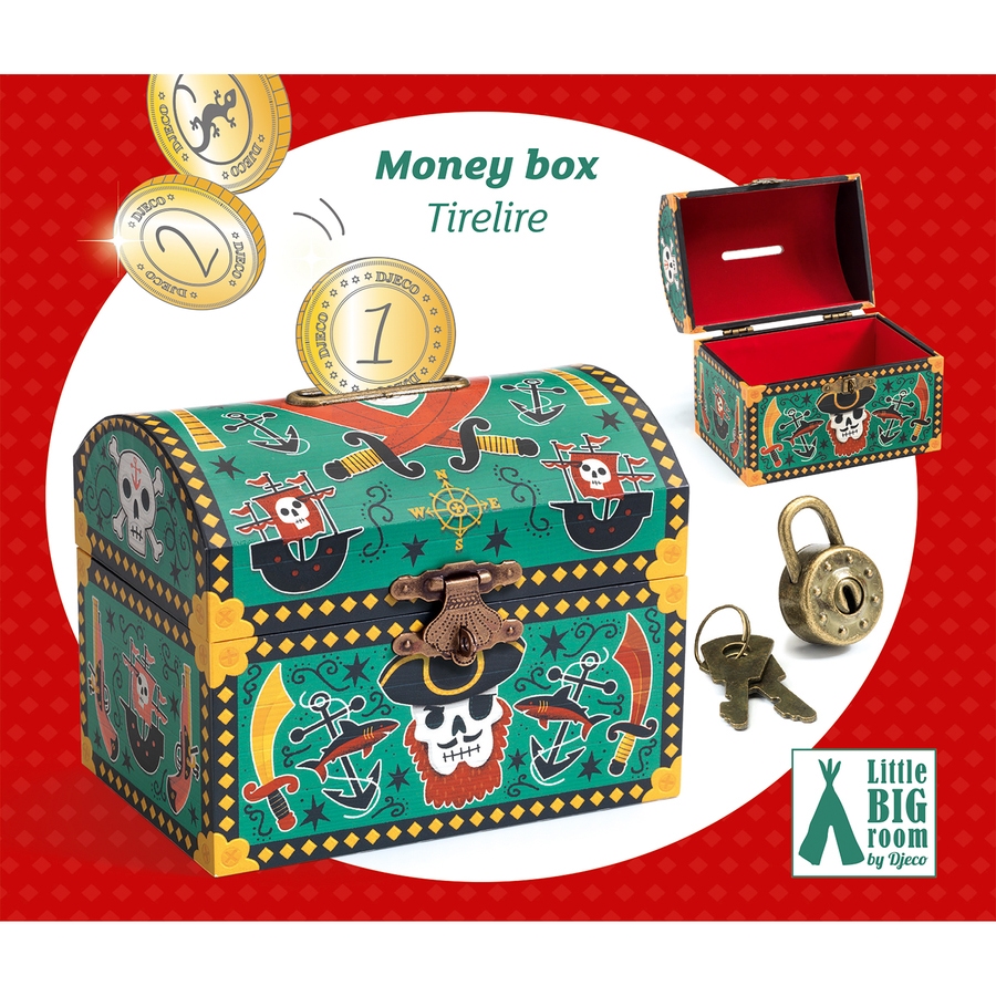 Une ravissante tirelire-coffre « pirate ». Un joli objet de décoration, avec une fente sur le dessus pour y glisser une à une ses pièces. Fermée d’un cadenas, la tirelire est fournie avec 2 clés pour pouvoir récupérer ses économies.